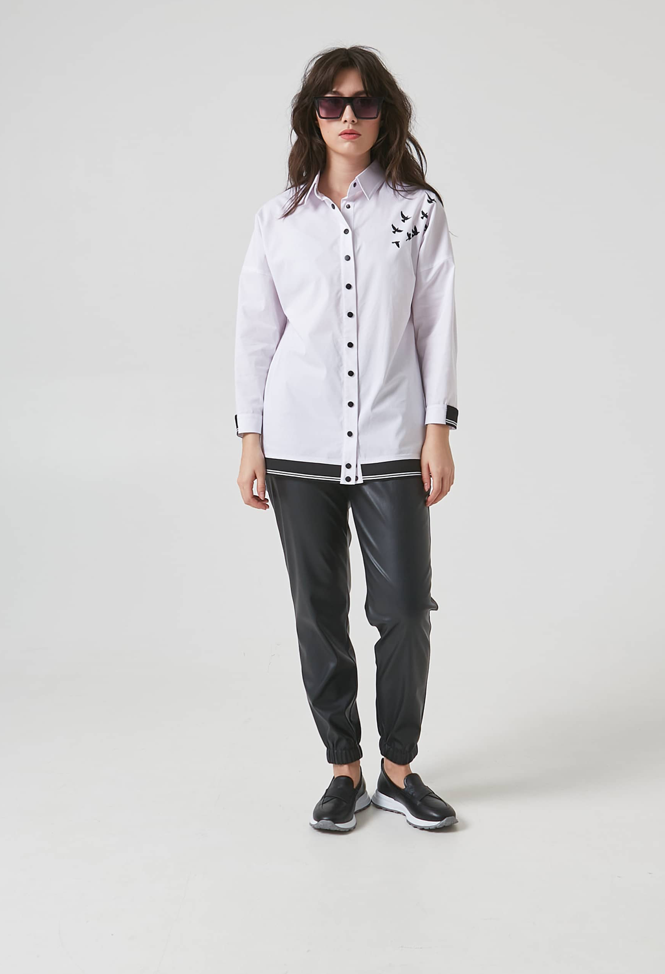 Удлиненная рубашка прямого силуэта с разрезами в боковых швах и ассиметричной линией низа, дизайнерская особенность модели - контрастные элементы: кнопки, декоративная резинка на манжетах, кант по низу и графичный принт в области груди. Перед с двумя вытачками на выпуклость груди, идущими из боковых швов. Застежка на 12 кнопок. Длинные втачные рукава со спущенной линией плеча и манжетами на прорезные петли и пуговицы. Стояче-отложной воротник.