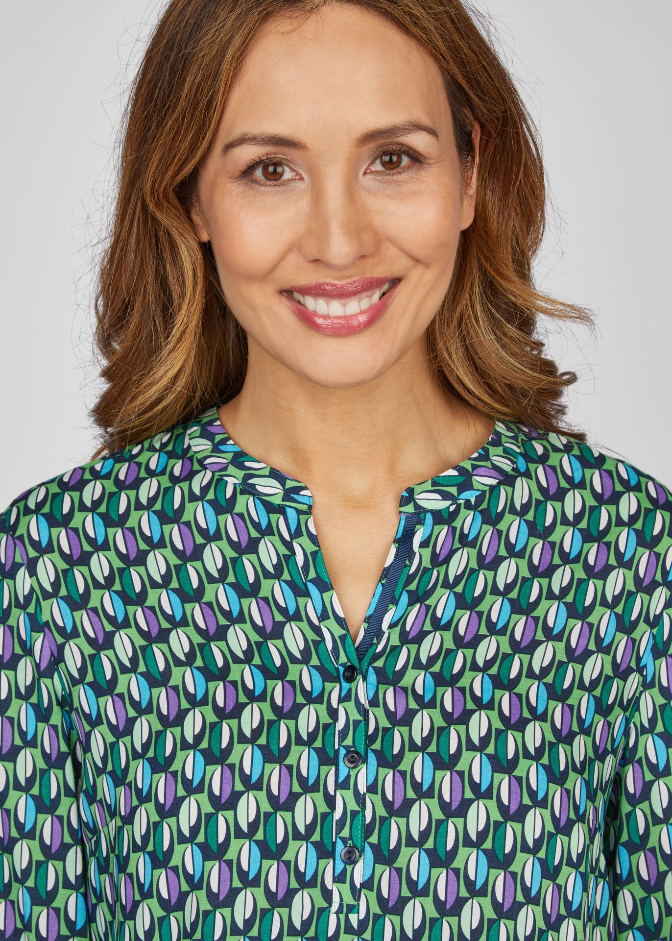 Блузка с минималистичным узором по всей поверхности – стильный и универсальный предмет гардероба. Изготовленная из высококачественной 100% вискозы, она обеспечивает ощущение комфорта и легкую, струящуюся текстуру. Блузка имеет небольшой воротник-стойку и элегантную планку на пуговицах, что придает ей классический и привлекательный вид. Эластичный низ обеспечивает удобную посадку и подчеркивает талию. Эластичные манжеты на рукавах придают изделию изысканность и позволяют персонализировать модель. Эта блузка с тонким узором по всей поверхности придаст любому образу утонченную элегантность.