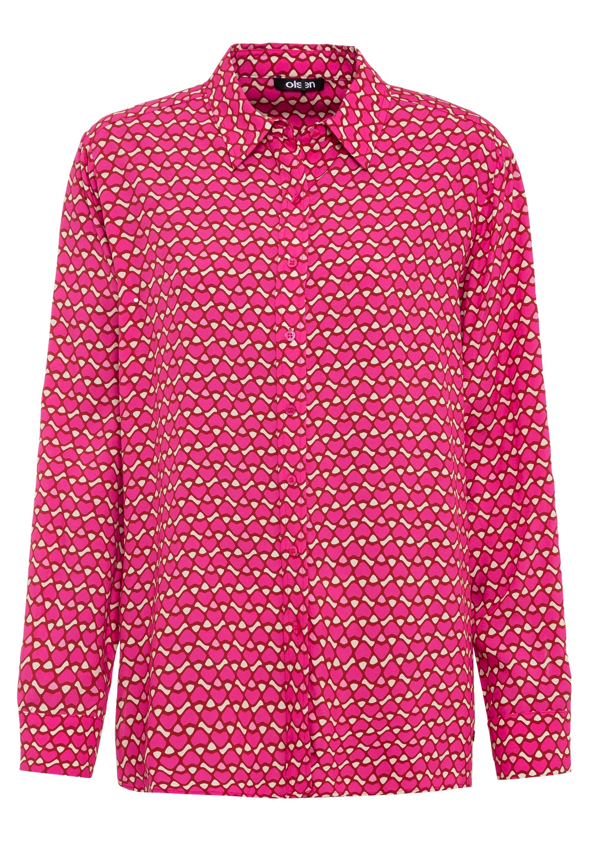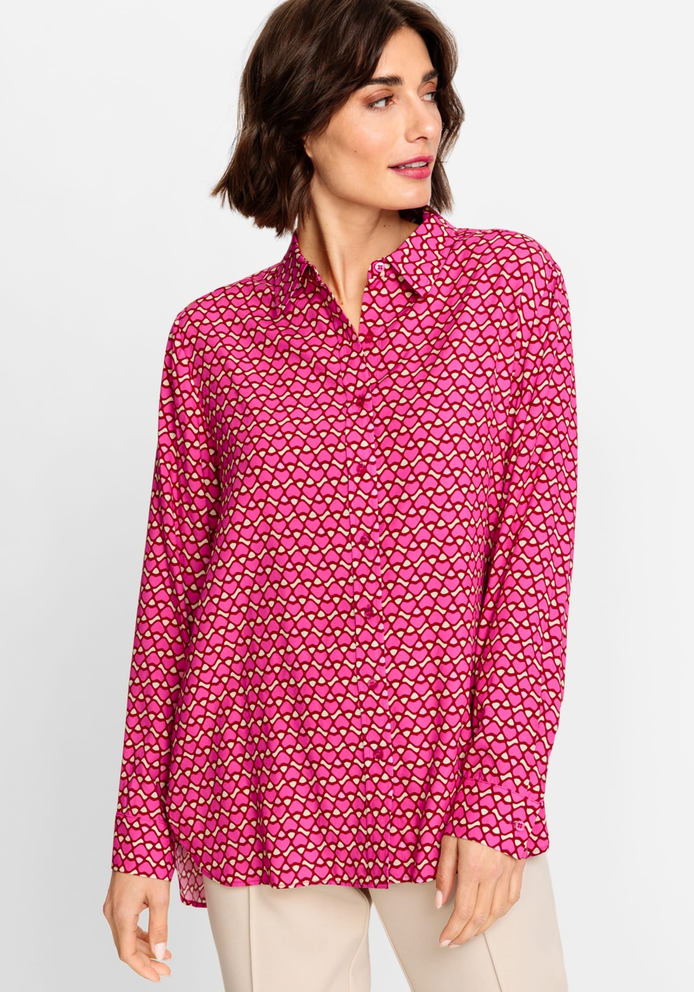 Яркая рубашка с очаровательным узором в виде сердечек по всей поверхности. В нем присутствуют все классические элементы рубашки: отложной воротник, планка на пуговицах спереди, рукава с манжетами и изящная складка посередине спины.