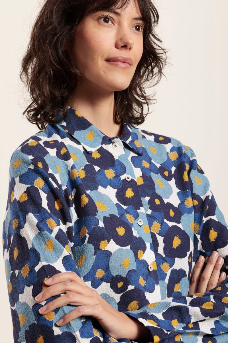 Рубашка с цветочным принтом из тисненого хлопка. Прямого покроя. Длинные рукава с небольшими манжетами. Нижние передние вытачки.