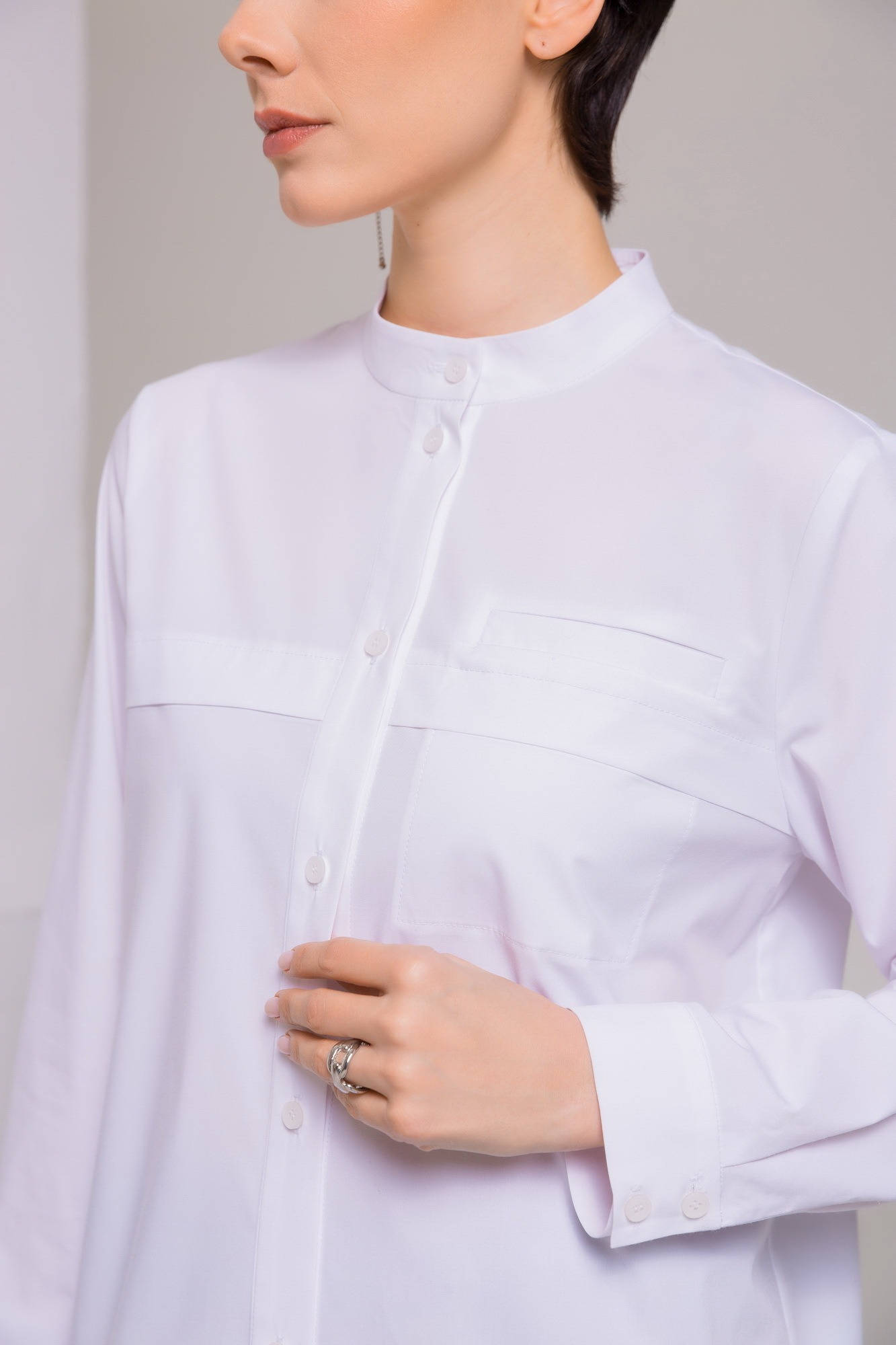 Вариант белой блузы, необходимой каждому гардеробу. Универсальная полуприталенная модель.