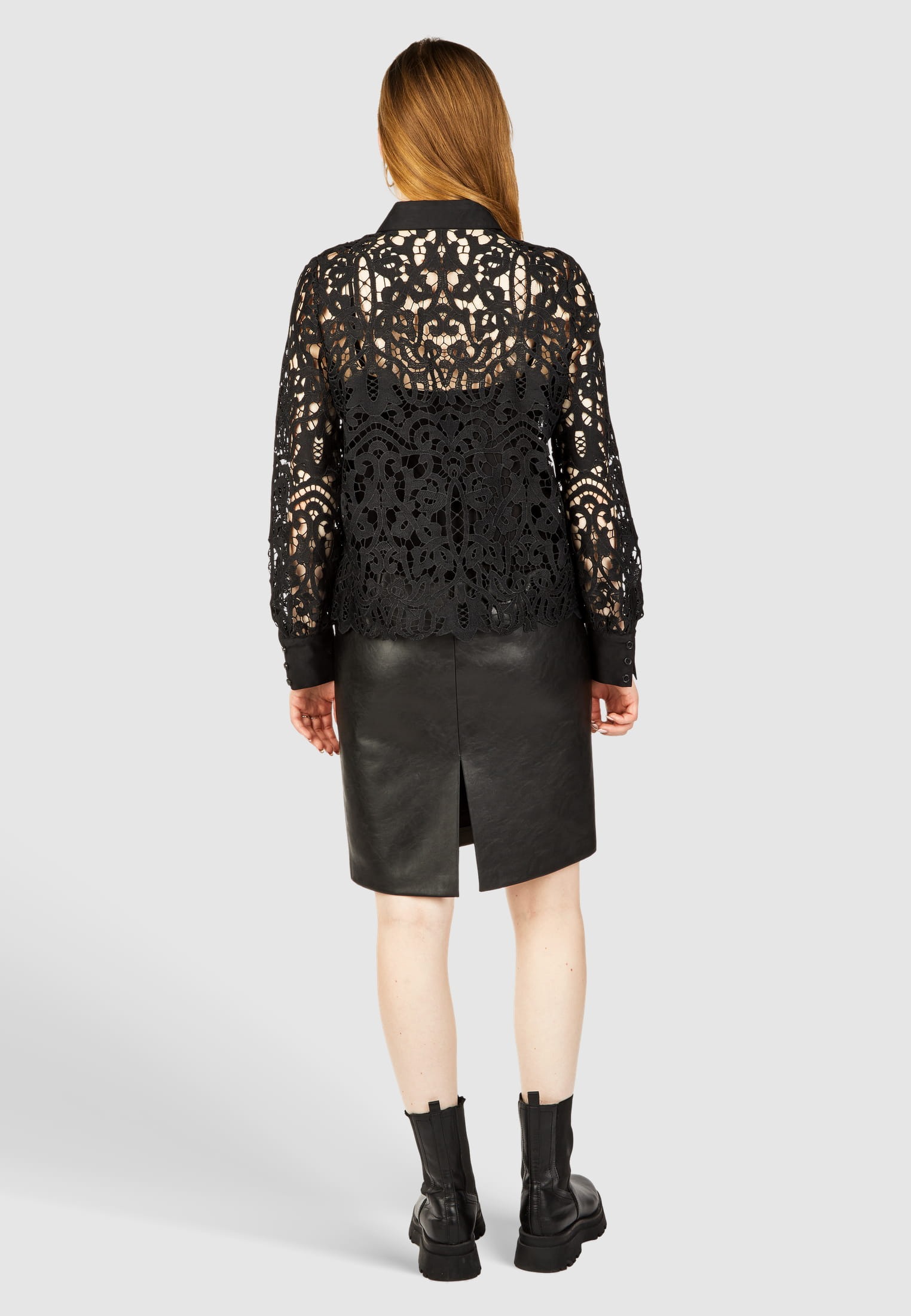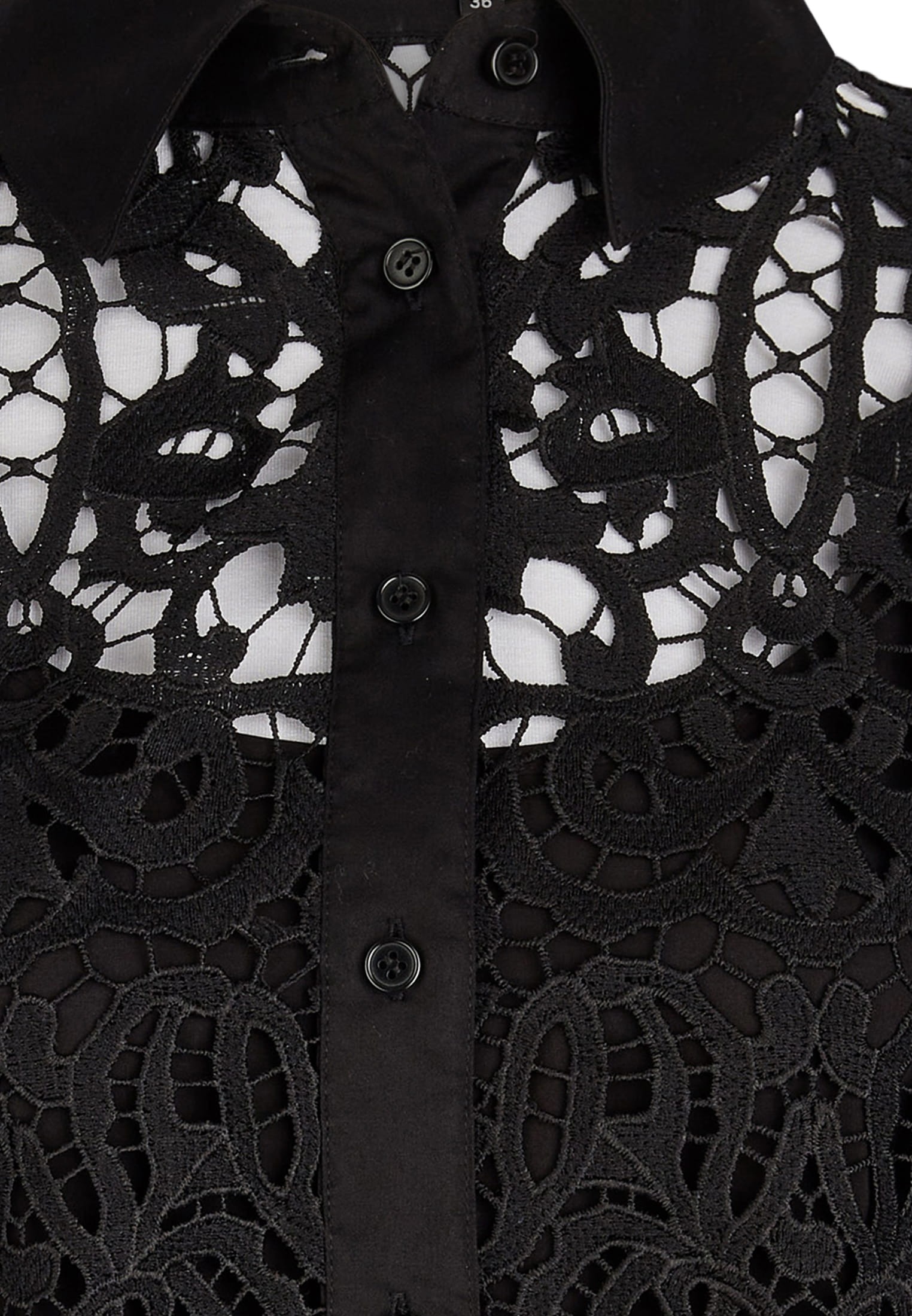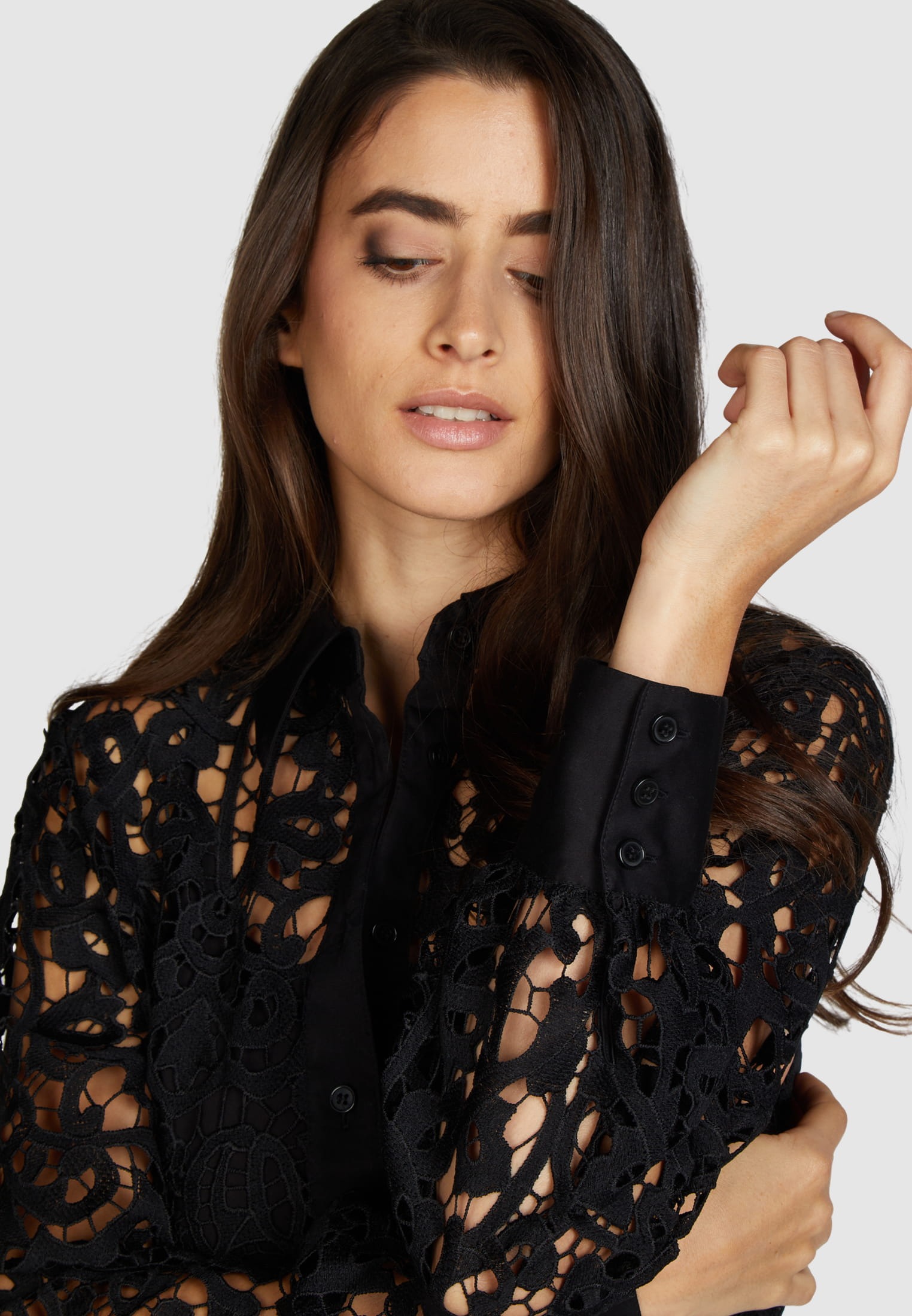 Кружевная блузка с деталями из поплина и эффектным мягким кружевом дополнена подходящим топом-спагетти в тон. Это создает образ с вау-эффектом. Продуманные детали, такие как подол с фестончатым краем и манжеты с разрезом, гармонично дополняют благородный дизайн.