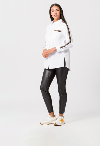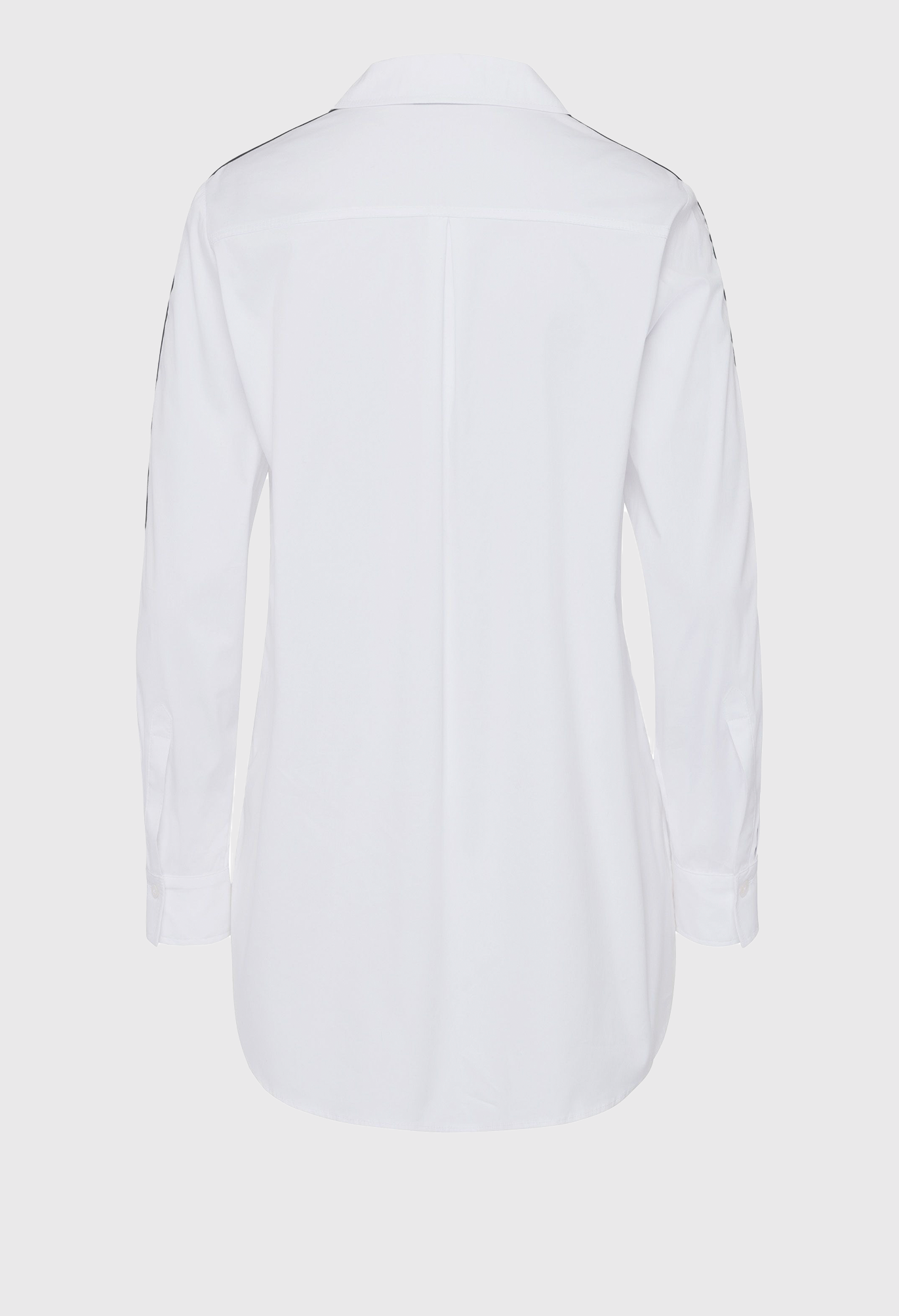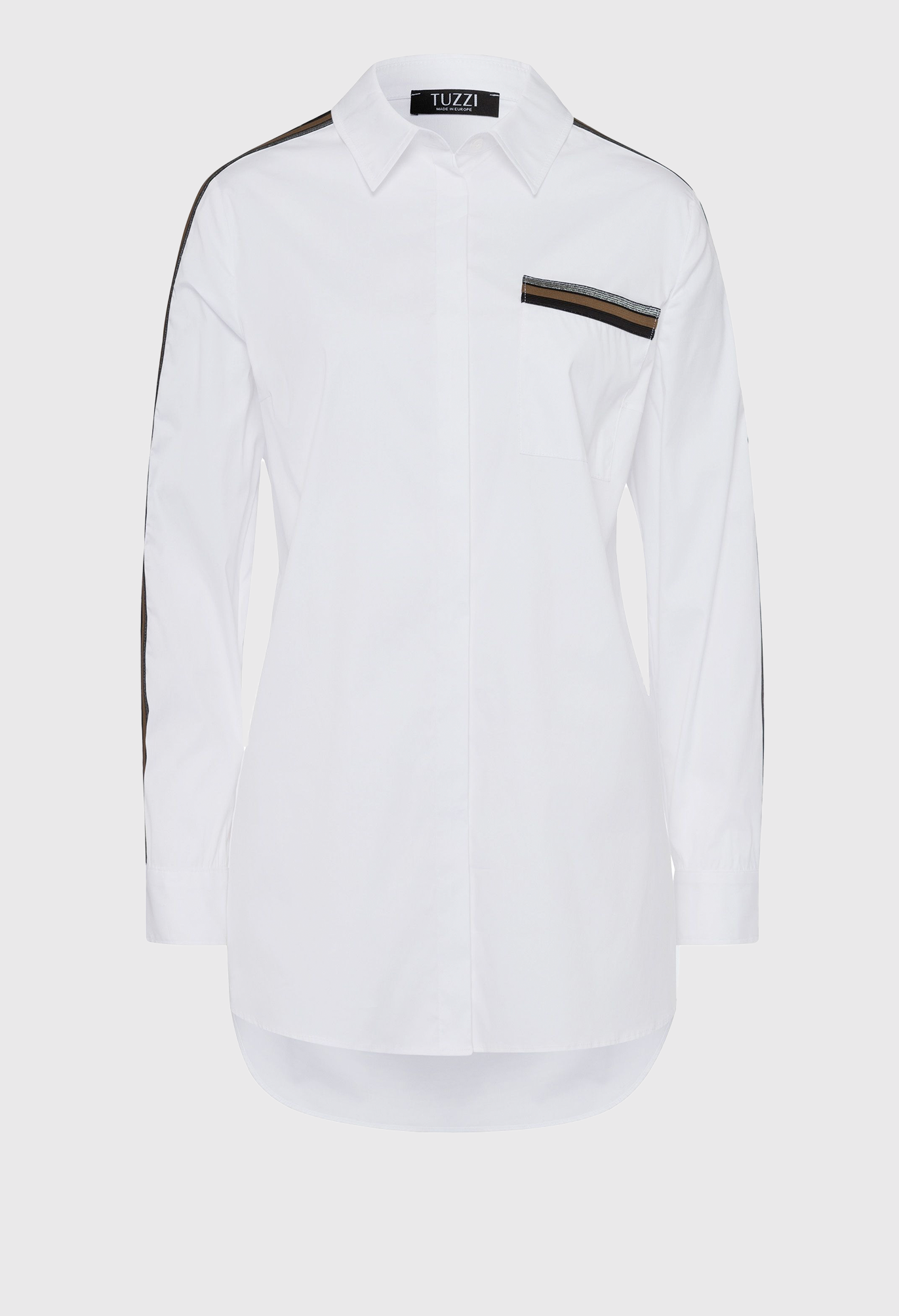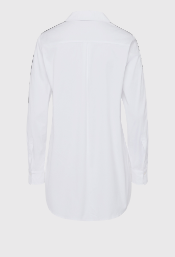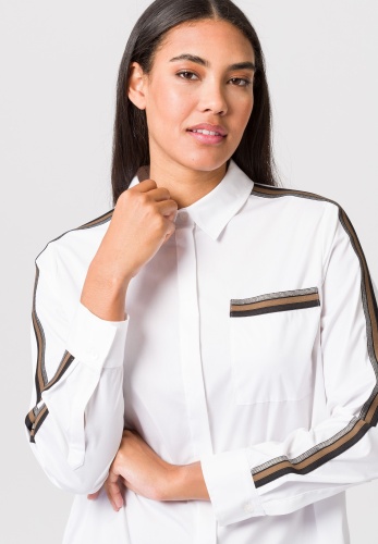 Длинная женская блузка со потайной планкой на пуговицах во всю длину. И еще одна надежная тенденция с универсальным потенциалом: классическая блузка-рубашка в повседневном длинном крое. Классический элегантный стиль может сочетаться как элегантно, так и непринужденно. Эта модель облегающего кроя из смесового хлопка дополнена накладными декоративными полосками вдоль нагрудного кармана и манжет рукавов. Высокие разрезы по низу позволяют длинному фасону идеально сочетаться с узкими или широкими брюками, юбками и джинсами.