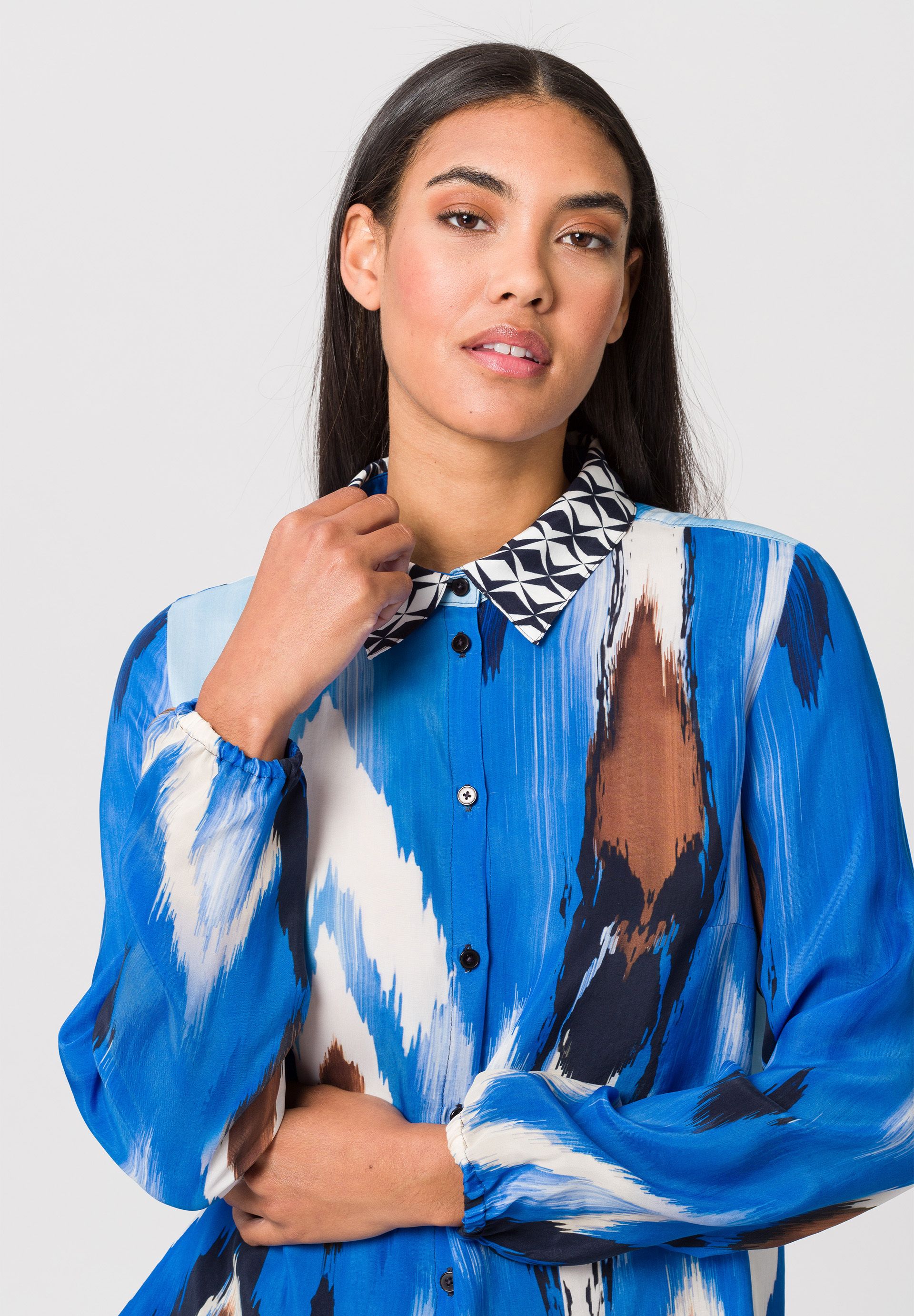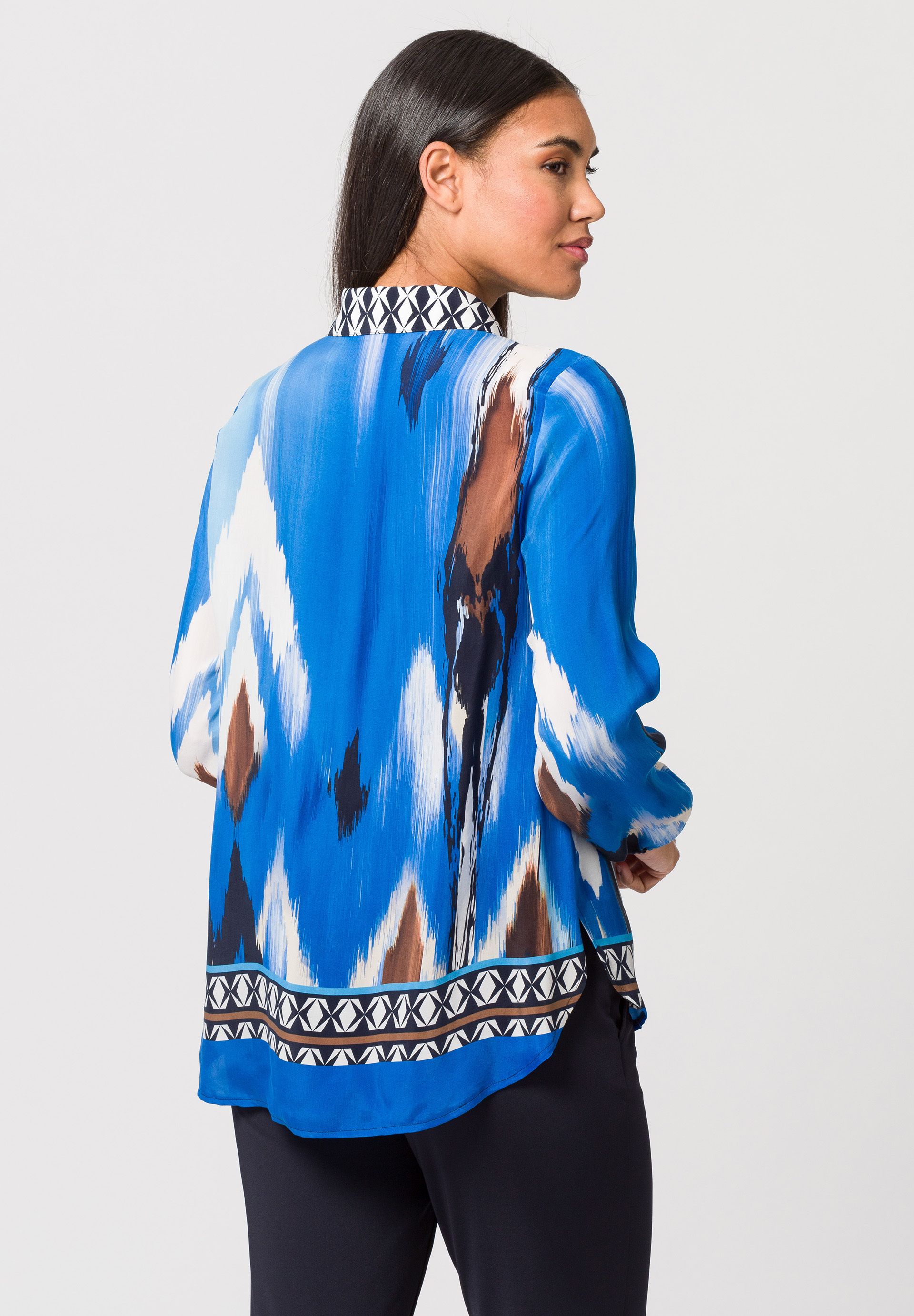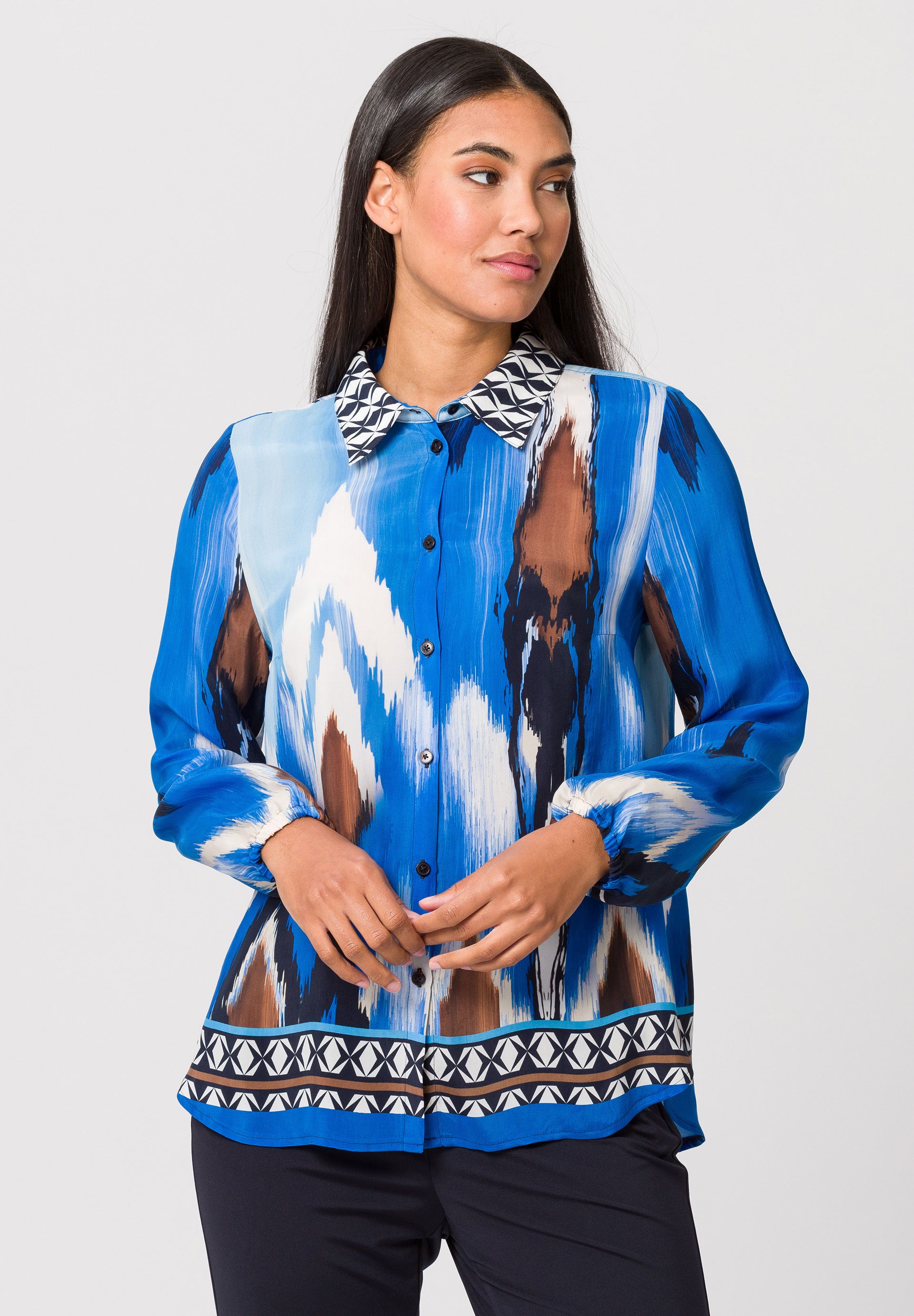 Блузка женская с планкой на пуговицах. Эта облегающая фигура модель из шелковистой ткани купро определенно подойдет для непринужденного делового гардероба и гардероба для отдыха. Удивительно изысканно: воротник блузки с контрастным рисунком и сильно закругленный подол блузки с соответствующим принтом по кайме.