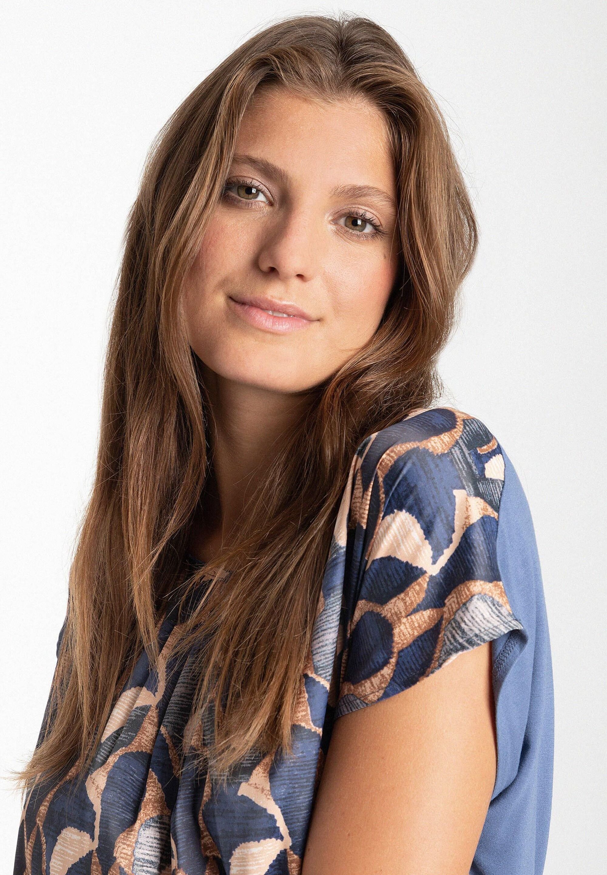 Свободная блузка-рубашка с современным графическим принтом и плиссированной деталью на вырезе. Прямая, свободная форма со спущенными плечами, круглый вырез горловины со складками спереди, сзади немного длиннее, чем спереди. Передняя часть из струящейся ткани. Спинка из мягкого вискозного трикотажа дымчато-синего цвета. Длина по размеру 42 - 64 см.