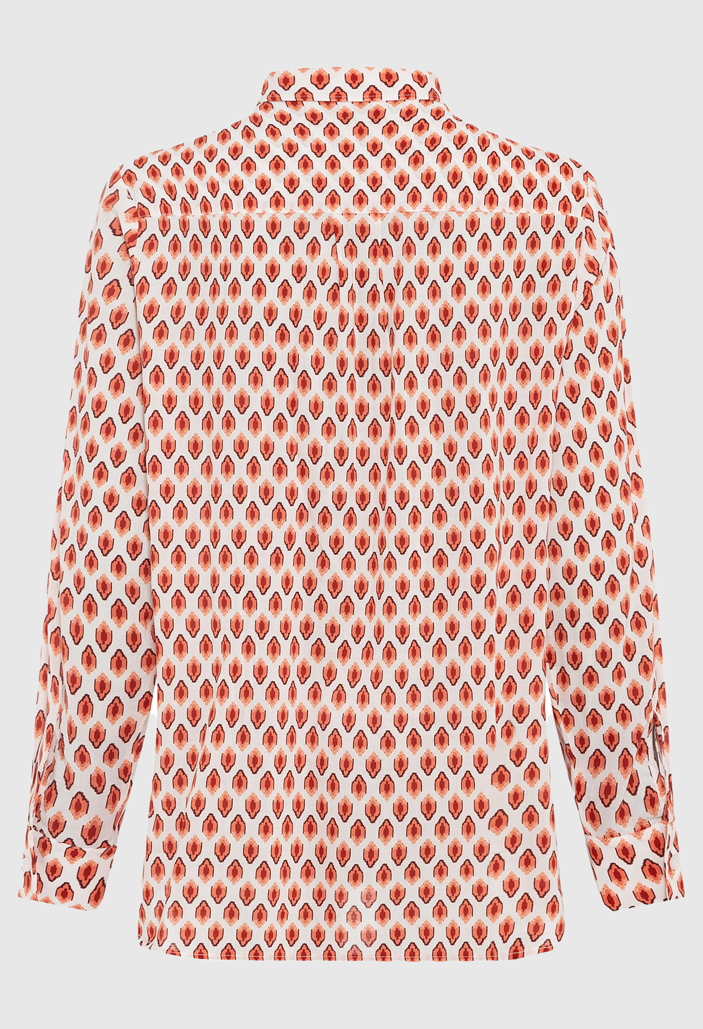 Классическая рубашка с эффектным геометрическим узором по всей поверхности в теплых осенних тонах. Отложной воротник, планка на пуговицах спереди, пуговицы на манжетах и складка на кокетке сзади.