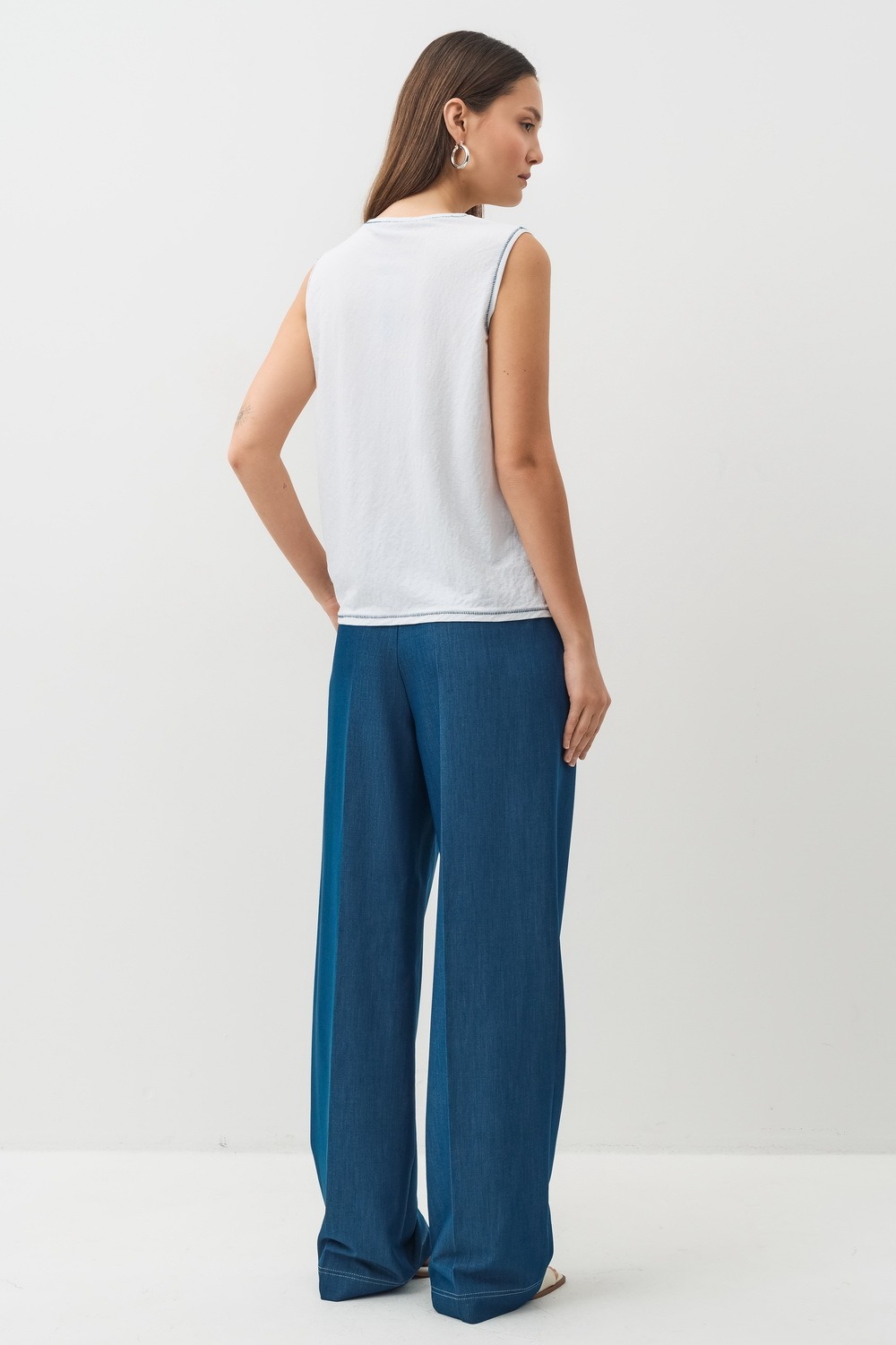 Блуза-топ A-образного силуэта. Горловина лодочкой. Проймы, горловина и низ блузы обработаны декоративной строчкой контрастными нитками.