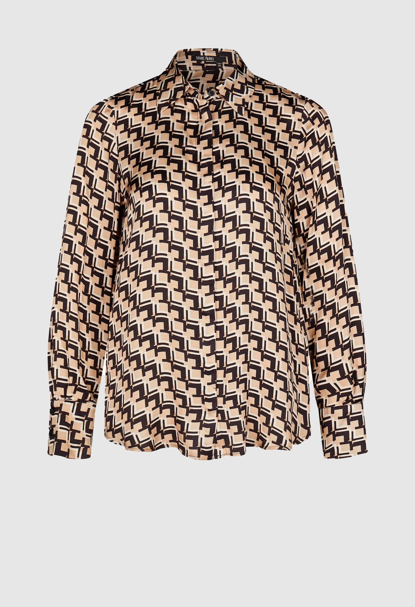 Блузка-рубашка изготовлена из приятного вискозного атласа для максимального комфорта. Графический принт по всей поверхности является ярким акцентом и не прерывается планкой с потайными пуговицами. В сочетании с длинной стрижкой это создает струящийся образ с вау-эффектом.