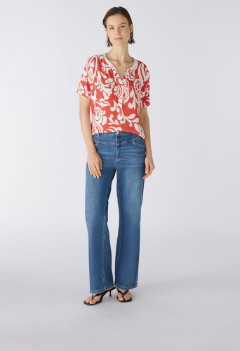 Легкая блузка в нашивном стиле со спортивными полосатыми деталями. Нашивка из вискозы: тканая спереди, трикотажная сзади. Повседневный крой, стандартная длина. Вырез туники с трикотажной ребристой отделкой. Вырез плеча, рукав свободно переходит в короткий рукав. Контрастная полосатая лента на плече. Длина для размера 42: 64 см.