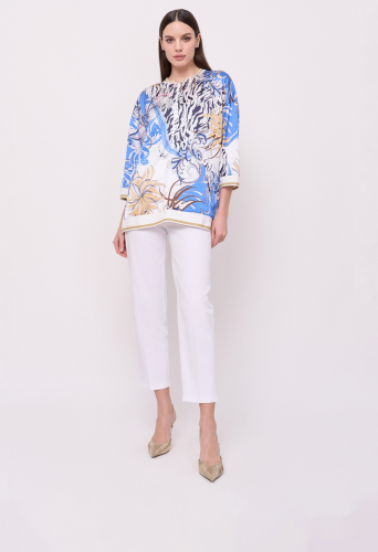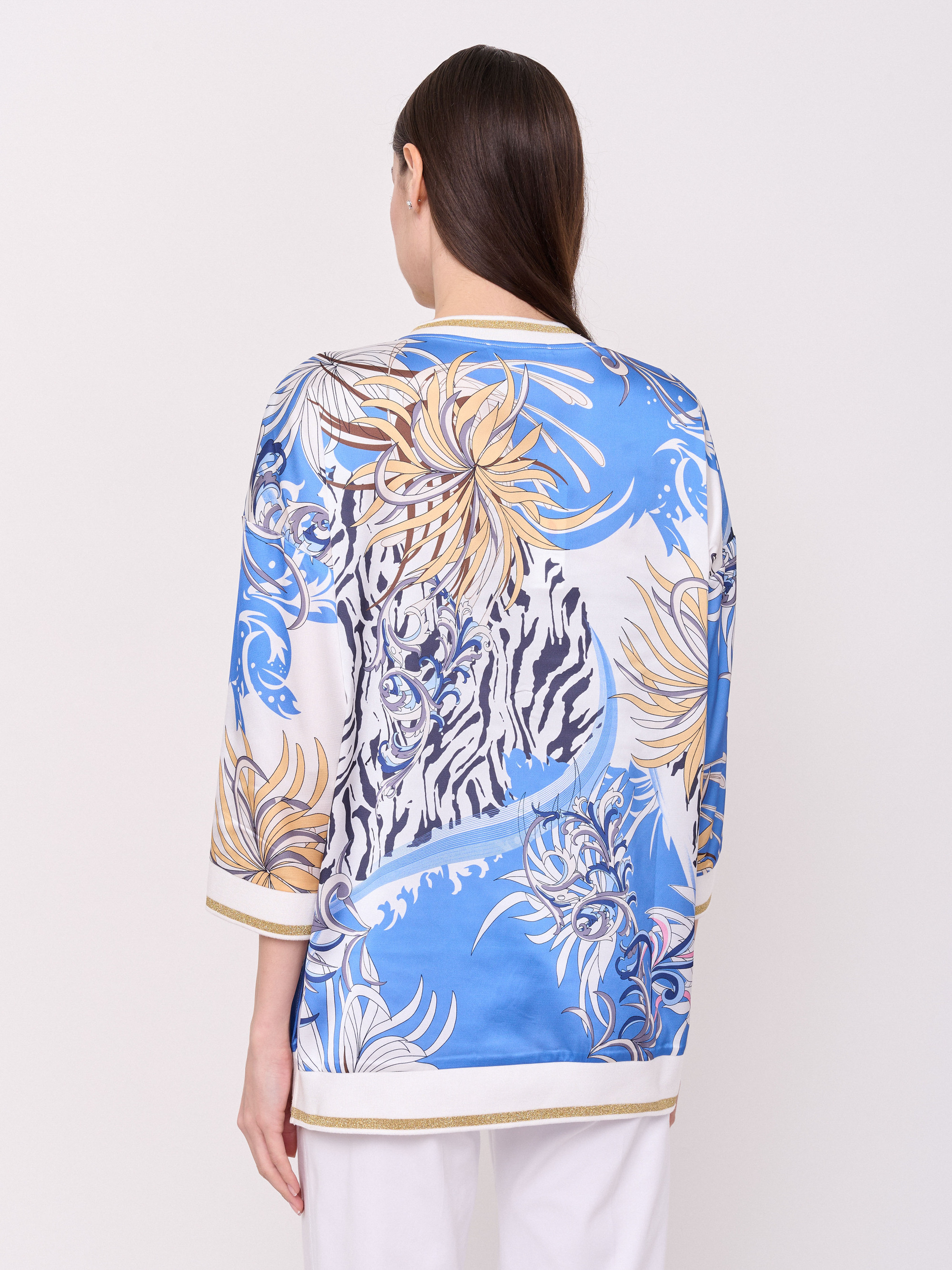 Детали: застежка молния, вырез горловины воротник-стойка, рукава 7/8, покрой прямой, рисунок цветы и растения, боковые разрезы, трикотажные манжеты с люрексом. Длина по спинке: 69 см.