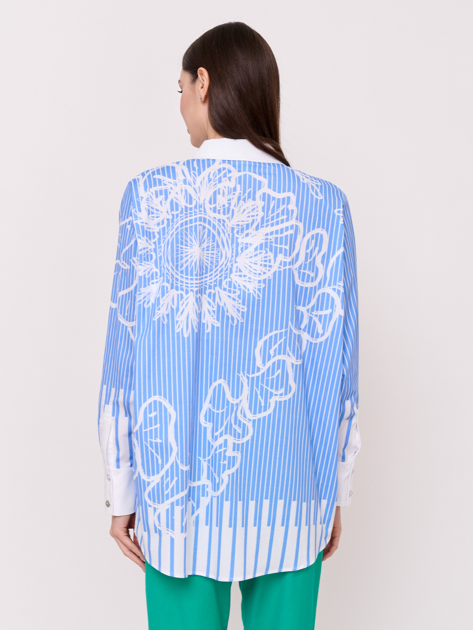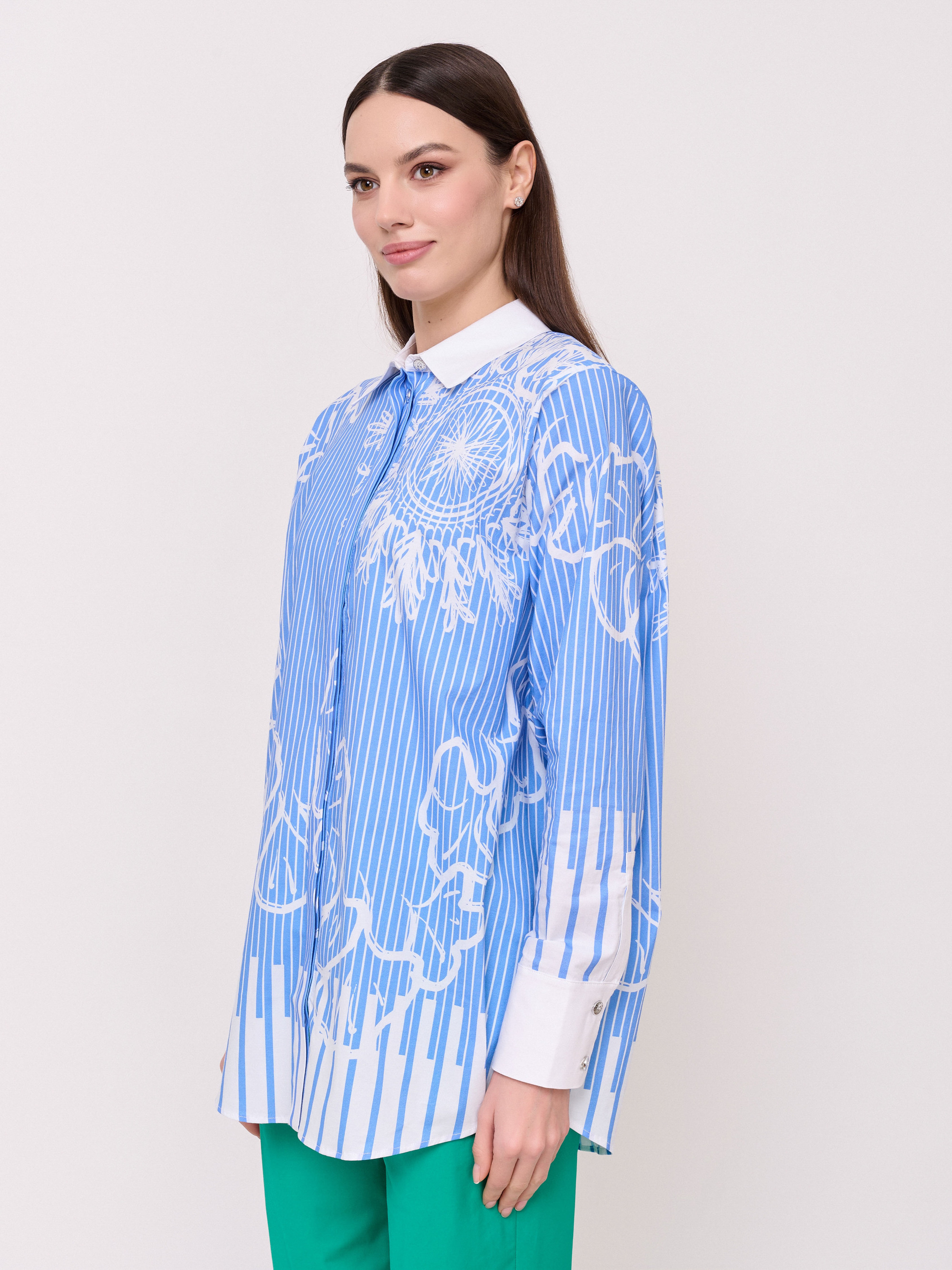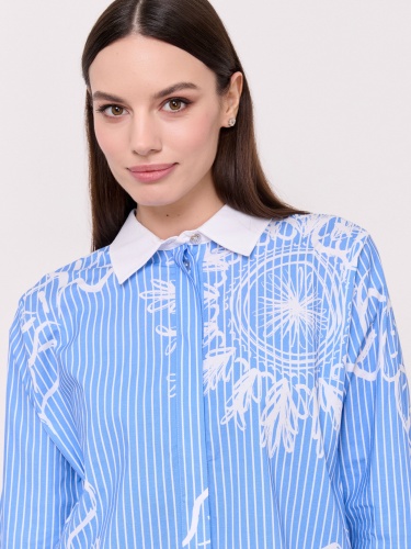 Детали: застежка пуговицы, вырез горловины отложной воротничок, рукава длинные с манжетами на пуговице, покрой прямой, рисунок полоска и абстракция, боковые разрезы. Длина по спинке: 76 см.