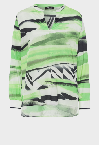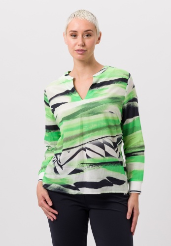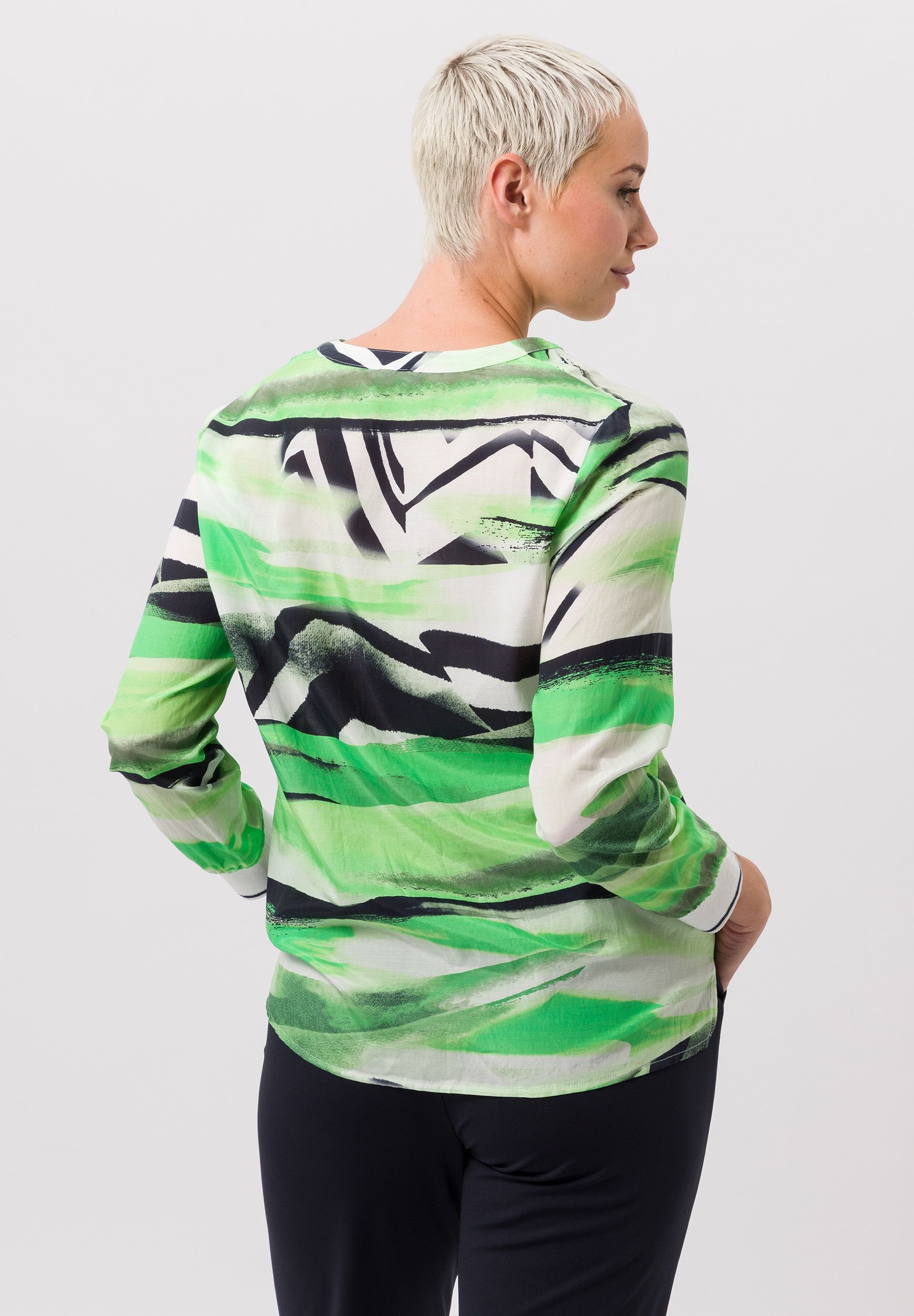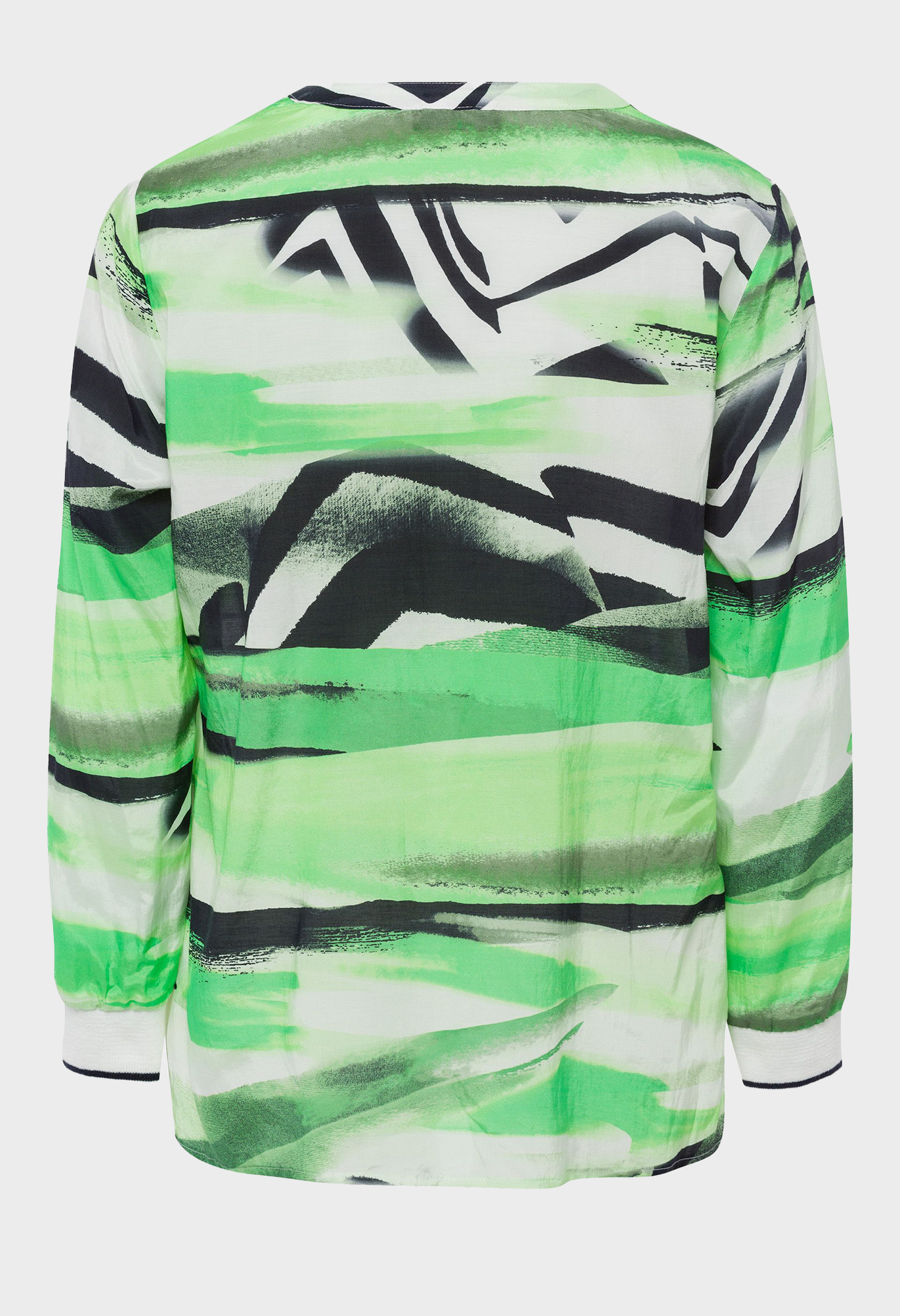Женская блузка без шнуровки с летним принтом по всей поверхности. Воздушная, легкая ткань из хлопка и вискозы не только обеспечивает комфорт в жаркие дни. Он также придает свежий вид благодаря летнему принту по всей поверхности. Свободный крой и повседневный низ с разрезами по бокам подчеркивают свежесть. Длинные рукава модно заканчиваются полосатыми манжетами в рубчик. Длина в 42 размере: 68 см.