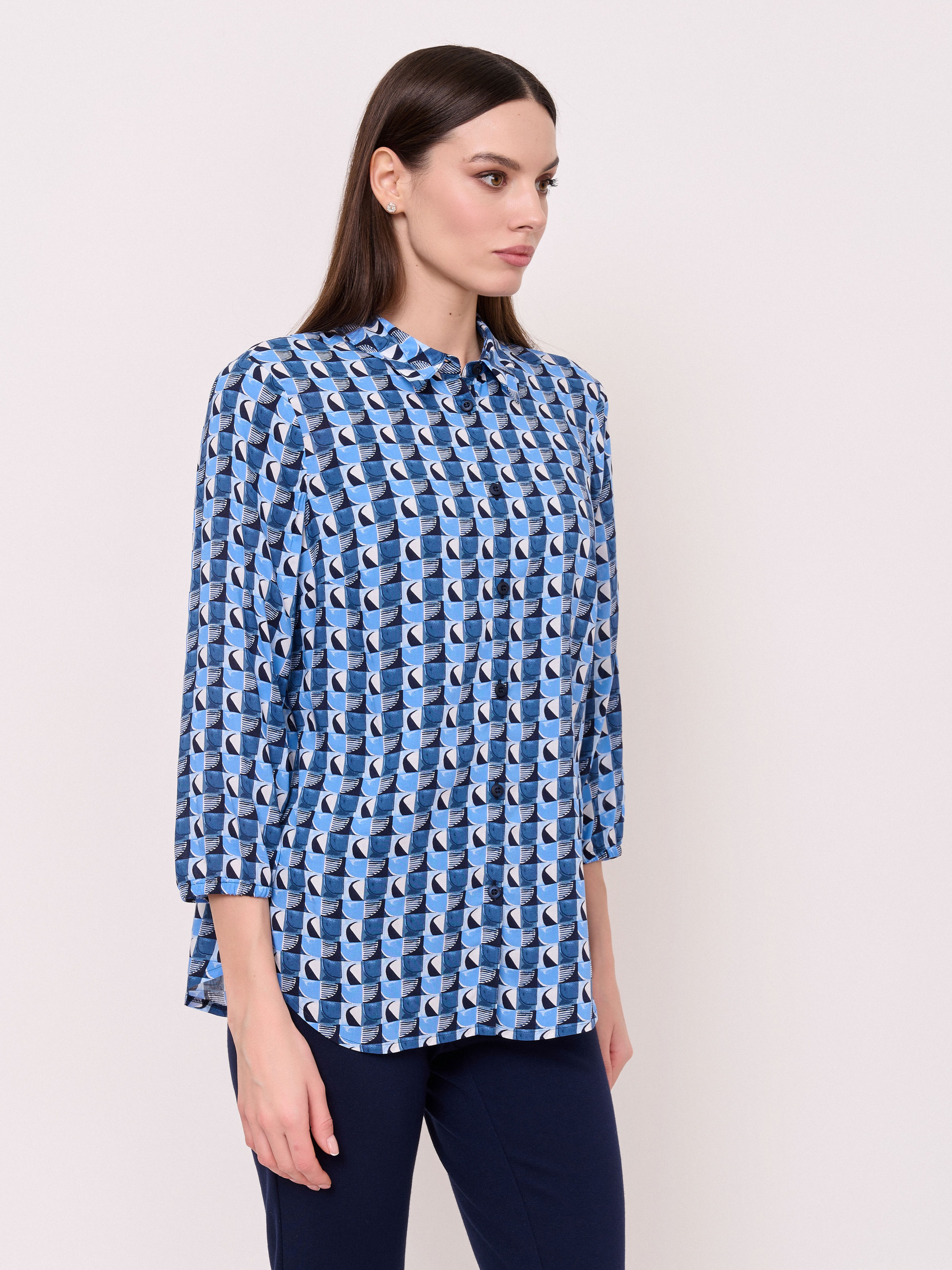 Детали: застежка пуговицы, вырез горловины отложной воротничок, рукава длинные, покрой рубашечный, рисунок орнамент. Длина по спинке: 65 см.
