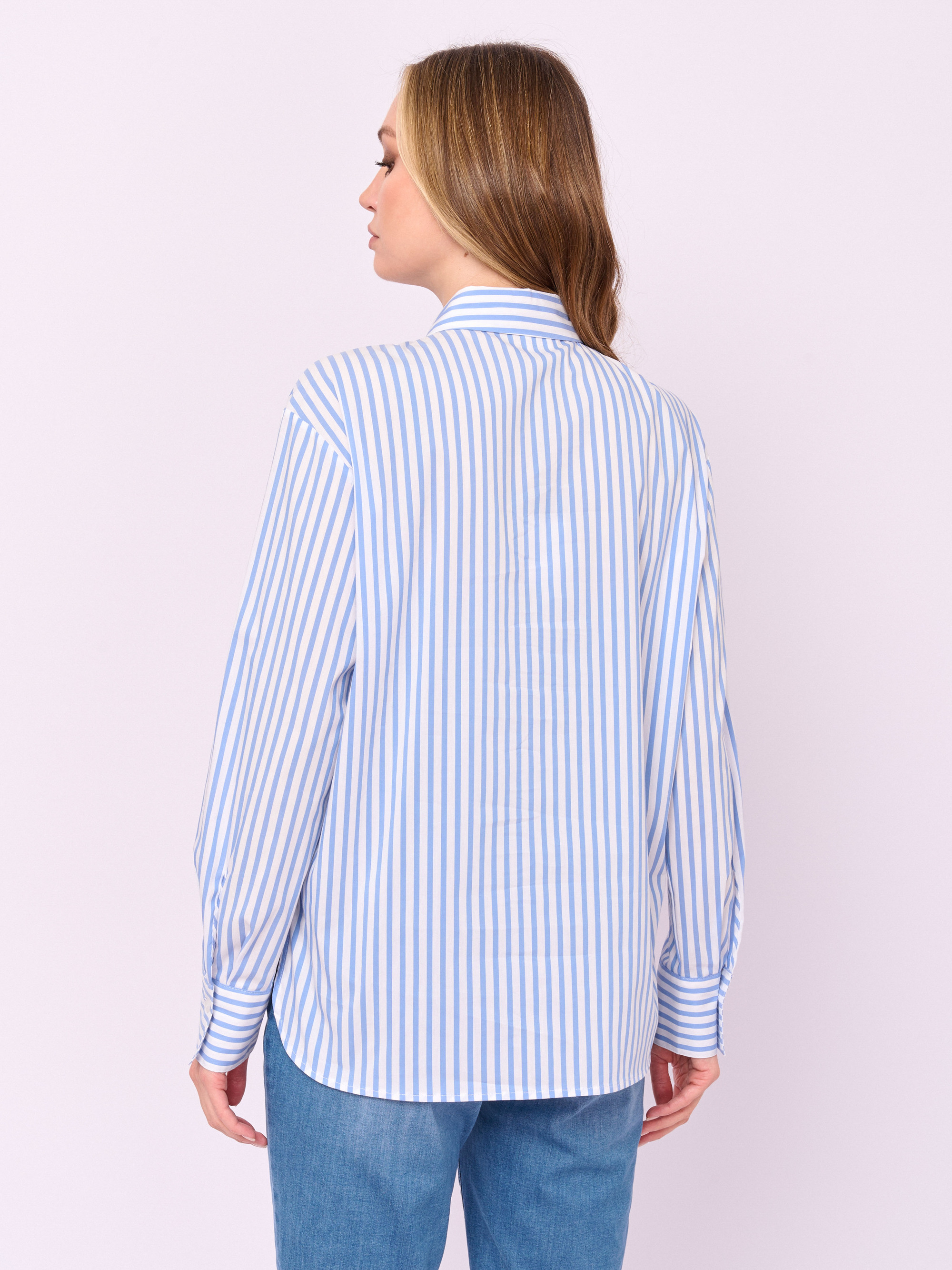 Детали: застежка пуговицы, вырез горловины отложной воротничок, рукава длинные, покрой рубашечный, рисунок полоска, боковые разрезы. Длина по спинке: 67 см.