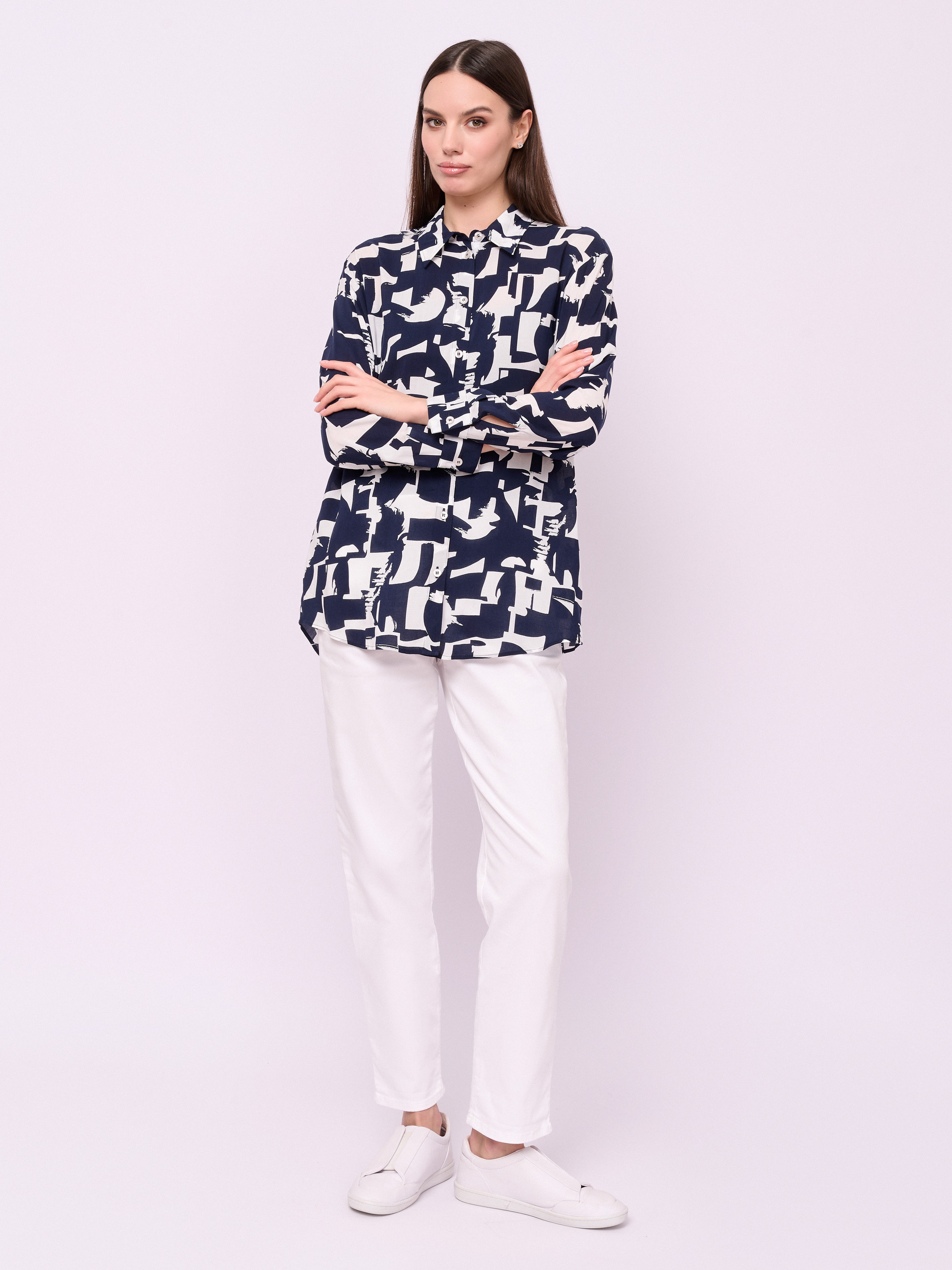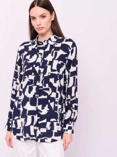 Детали: застежка пуговицы, вырез горловины отложной воротничок, рукава длинные, покрой рубашечный, рисунок абстракция. Длина по спинке: 70 см.