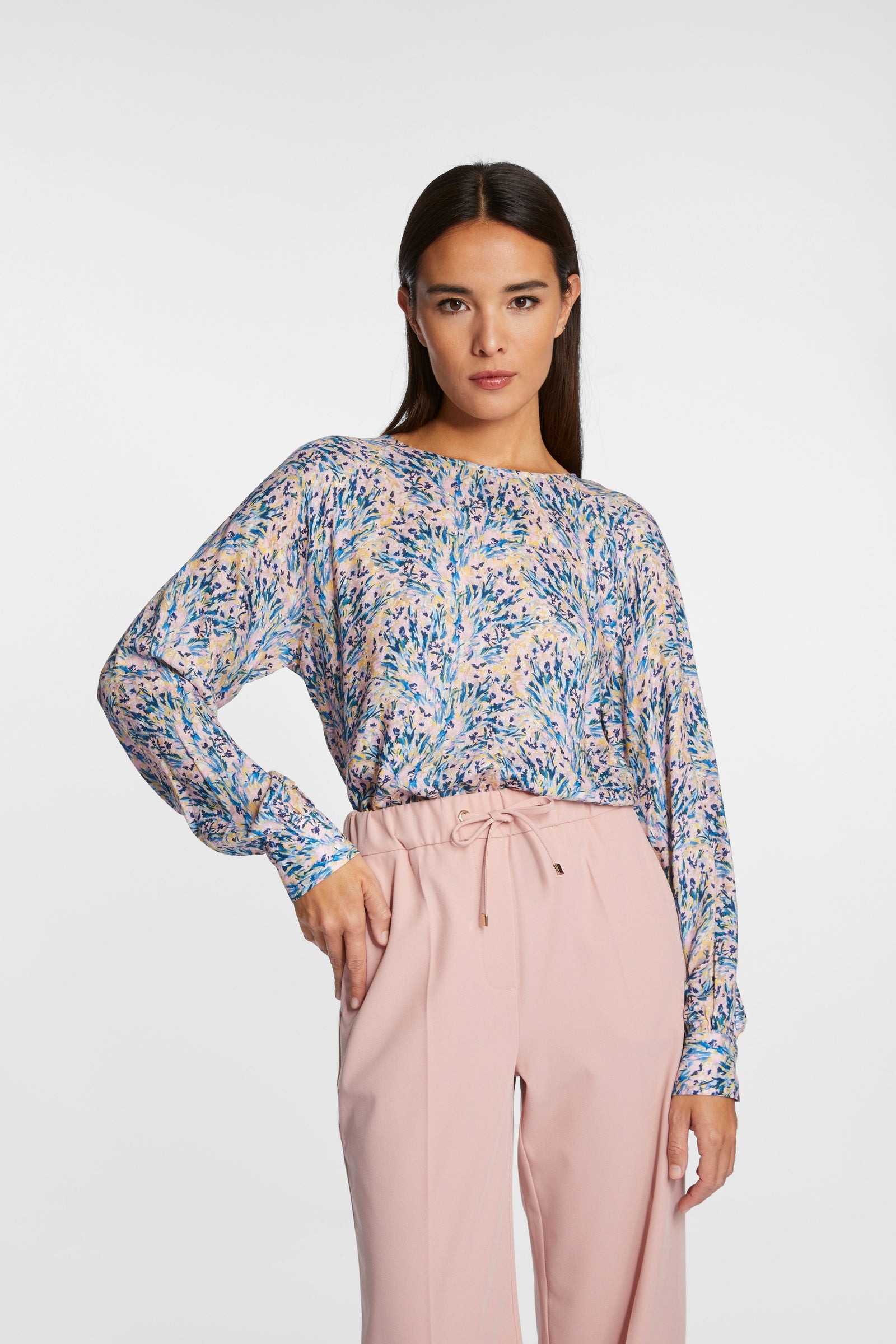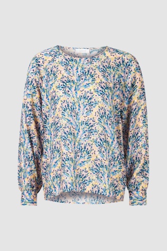 Блуза с размытым принтом и круглым вырезом – настоящая универсальная вещь. Свободный крой окутывает вашу фигуру мягкой струящейся вискозой. К красивым деталям относятся блестящие декоративные пуговицы на манжетах рукавов. Длина для размера 42: 70 см. Окружность груди для размера 42: 92 см.