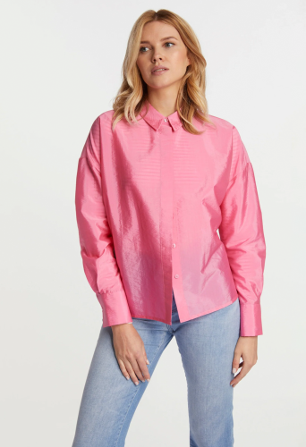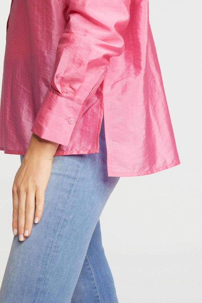 Однотонная блузка свободного кроя из парашютного шелка с мятым эффектом. Планка на потайных пуговицах, воротник и рукава с манжетами добавляют классический акцент. Блуза имеет разрезы по бокам и удлиненную спинку. Длина для размера 42: 68 см. Окружность груди для размера 42: 124 см.