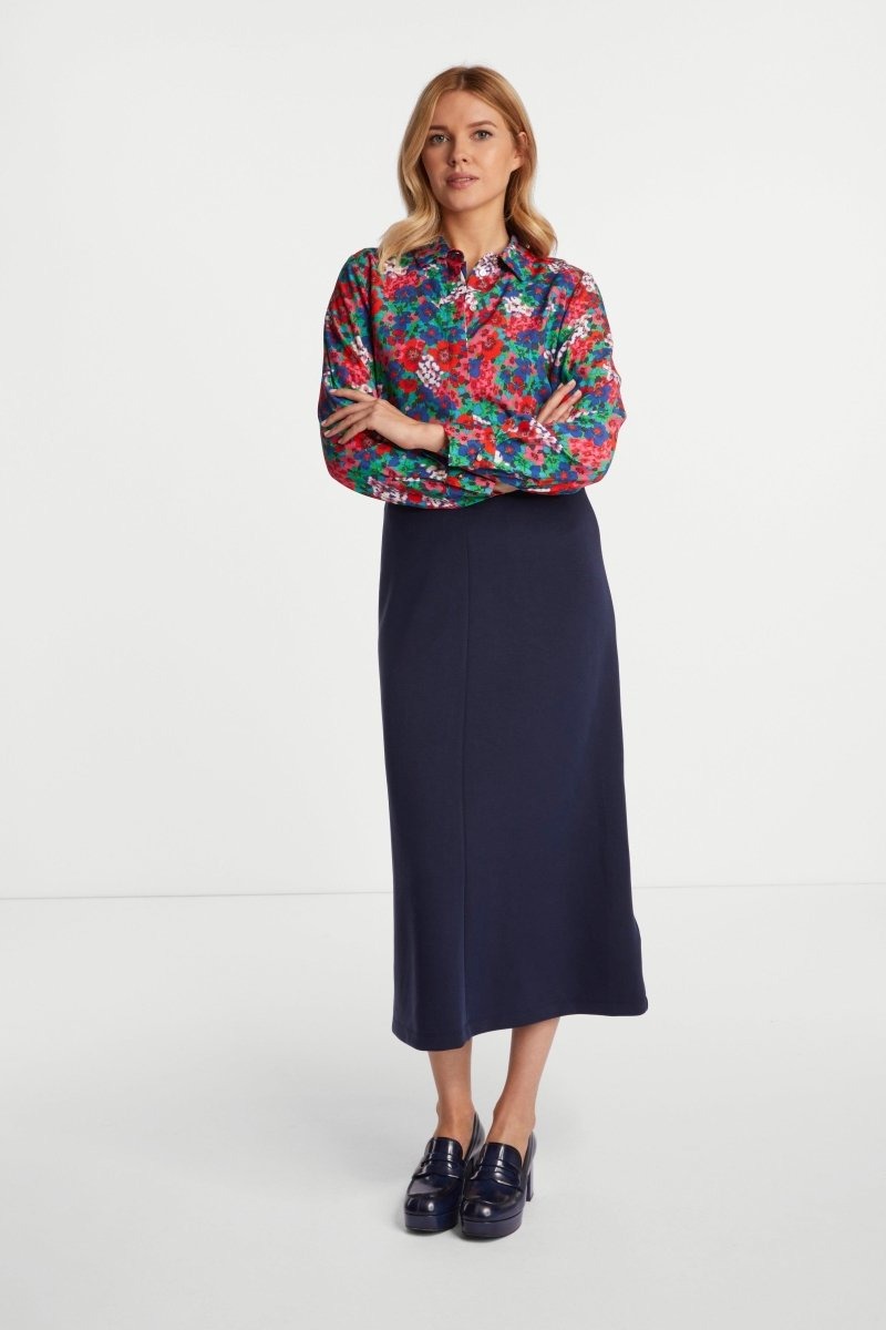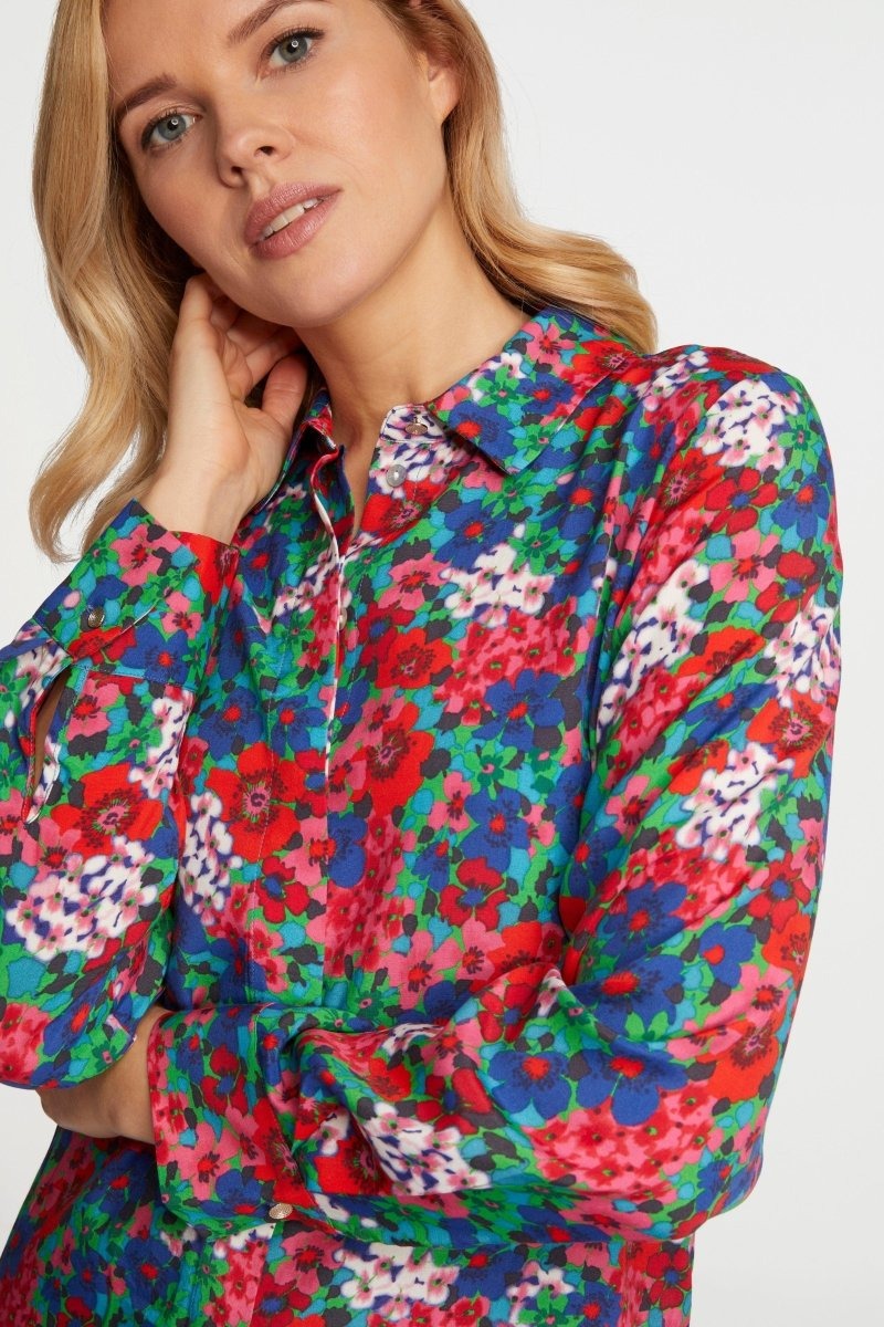 Блузка создает привлекательный цветочный образ. Воротник, планка с потайными пуговицами и манжеты на пуговицах придают изделию классический вид. Длина для размера 42: 66 см. Окружность груди для размера 42: 92 см.