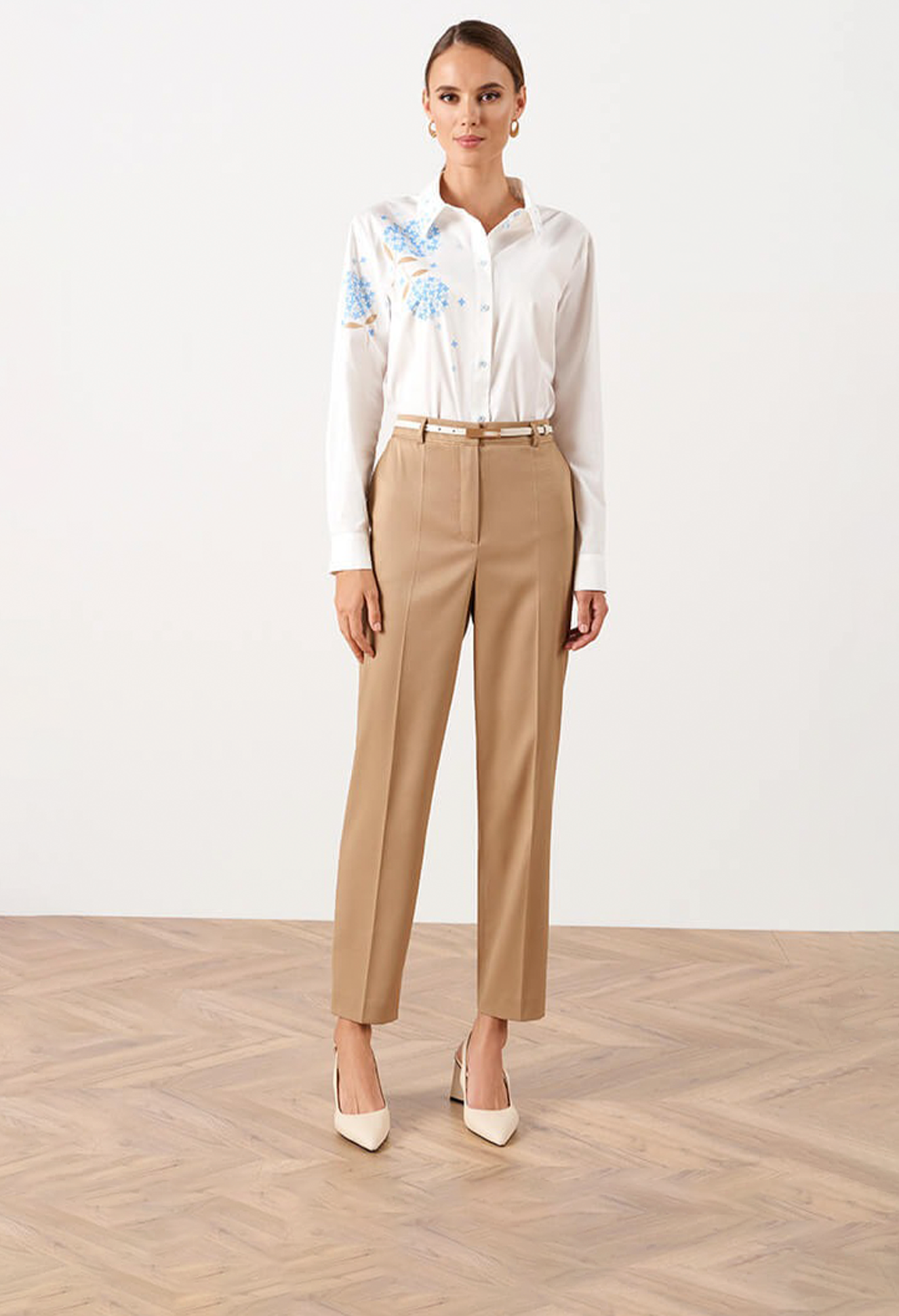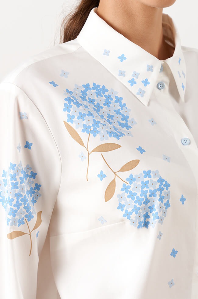 Классическая блузка-рубашка свободного силуэта, выполнена из хлопкового полотна. Отложной воротник-стойка. Центральная застежка на контрастные пуговицы. Спущенная линия плеча, рукава сосборены на манжету с разрезом и застежкой на контрастные пуговицы. В шов манжеты заложены складки. Спинка с кокеткой. Спереди выполнен дизайнерский принт «Гортензия».