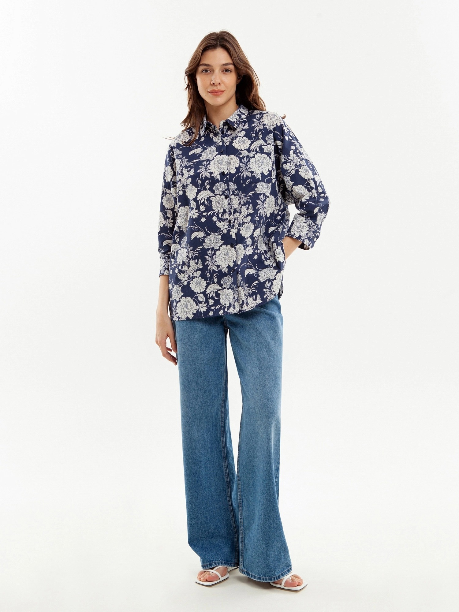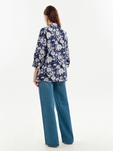 Свободная блуза из принтованной хлопковой ткани. Блуза с классическим отложным воротником и планкой на пуговицах. Рукава широкие с манжетами. На полочке накладкой карман.