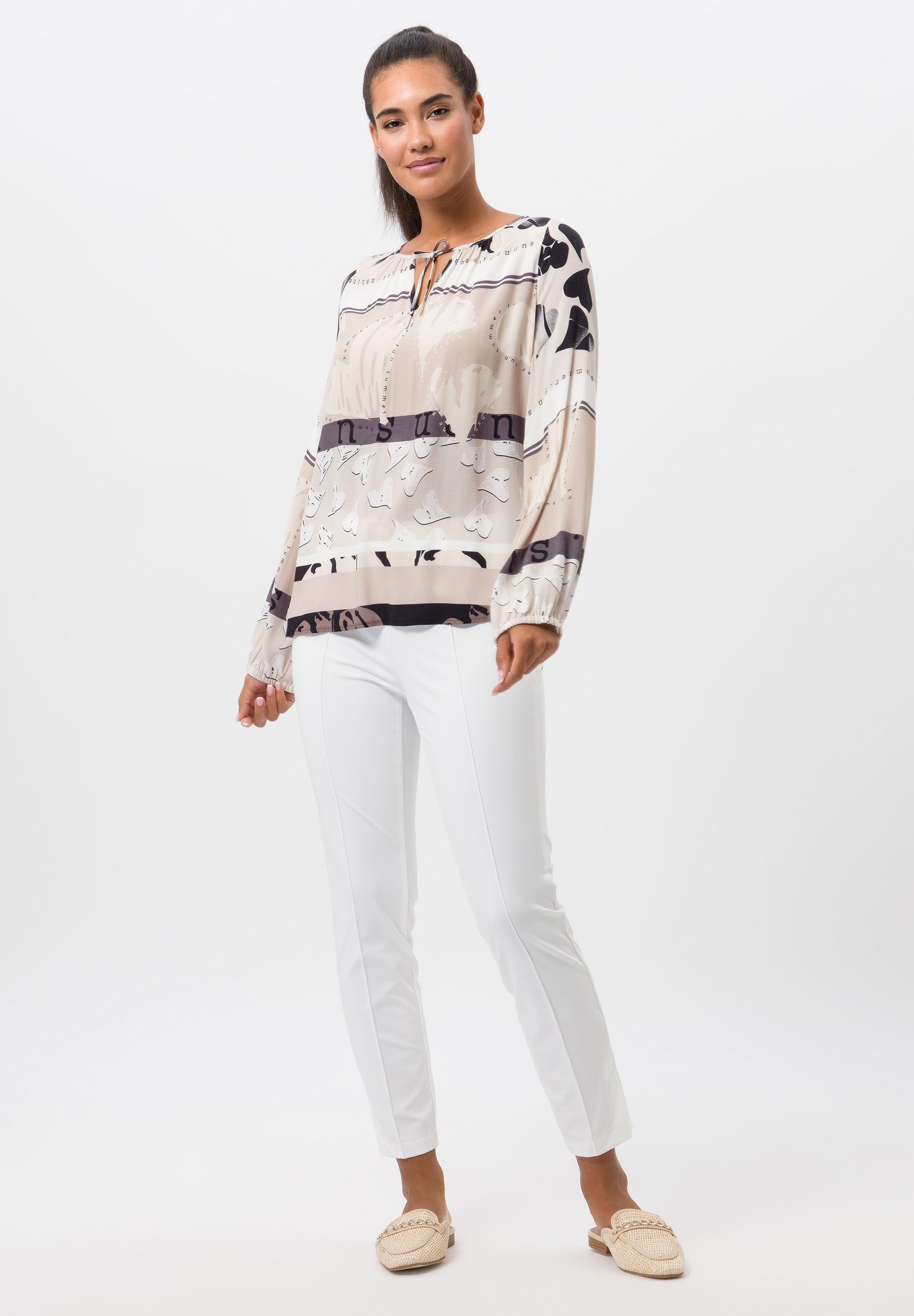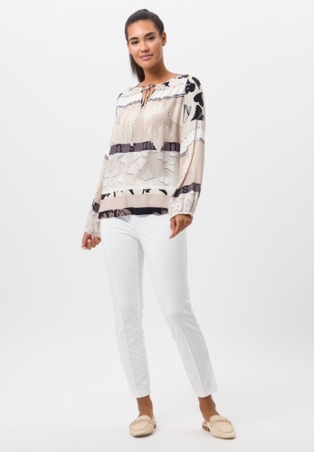 Блуза с рукавами-кимоно. Модель акцентна с помощью захватывающего сочетания узоров. Дикое сочетание узоров проявляется благодаря приглушенной цветовой гамме. Крой блузки слегка расклешенный, ткань - шелковистая комбинация купры и вискозы. Помимо длинных рукавов реглан на резинке, блузка имеет вырез-тунику на завязках. Длина в 42 размере - 68 см.