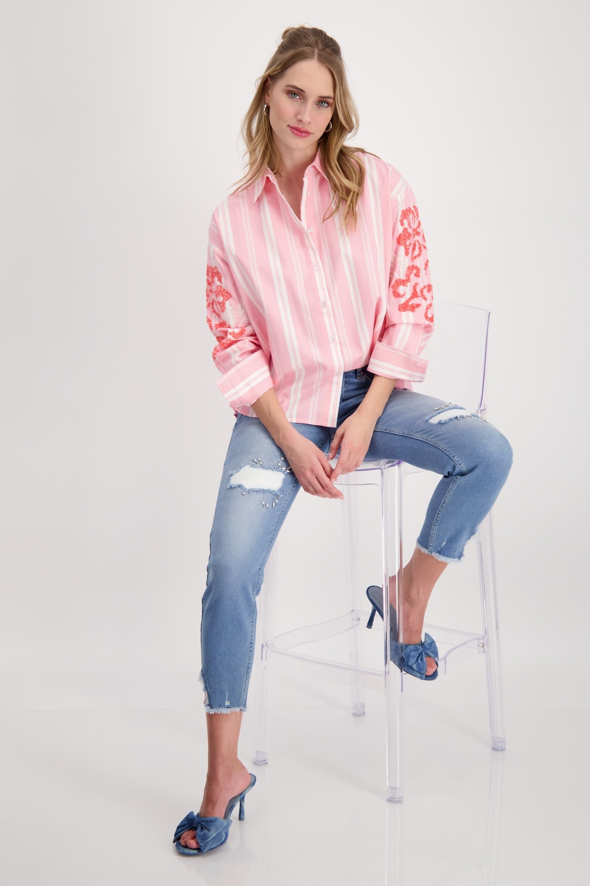 Блузка изготовлена из 100% хлопка и имеет полосатый дизайн с цветами из пайеток на рукаве. Регулярная посадка. Воротник рубашки. Подол рукава с манжетами. Лента для пуговиц. Удлиненная, закругленная спина. Длина спинки 44-го размера составляет 70 см, длина переда 66 см.