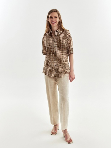 Свободная хлопковая блуза с отложным воротником и планкой в принте идеально впишется в ваш весенний гардероб. Короткий и широкий рукав с патой позволит активно проводить время в городе. По бокам небольшие разрезы.