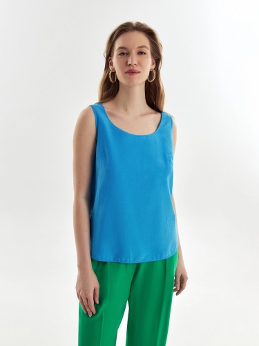 Свободная блуза на широких лямках с глубоким овальным вырезом из блузочной ткани небесно-голубого цвета.