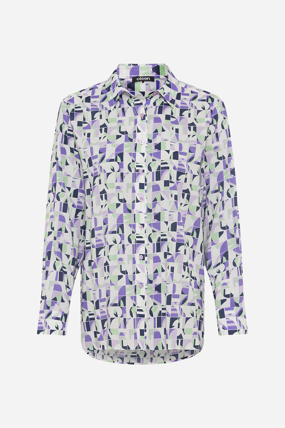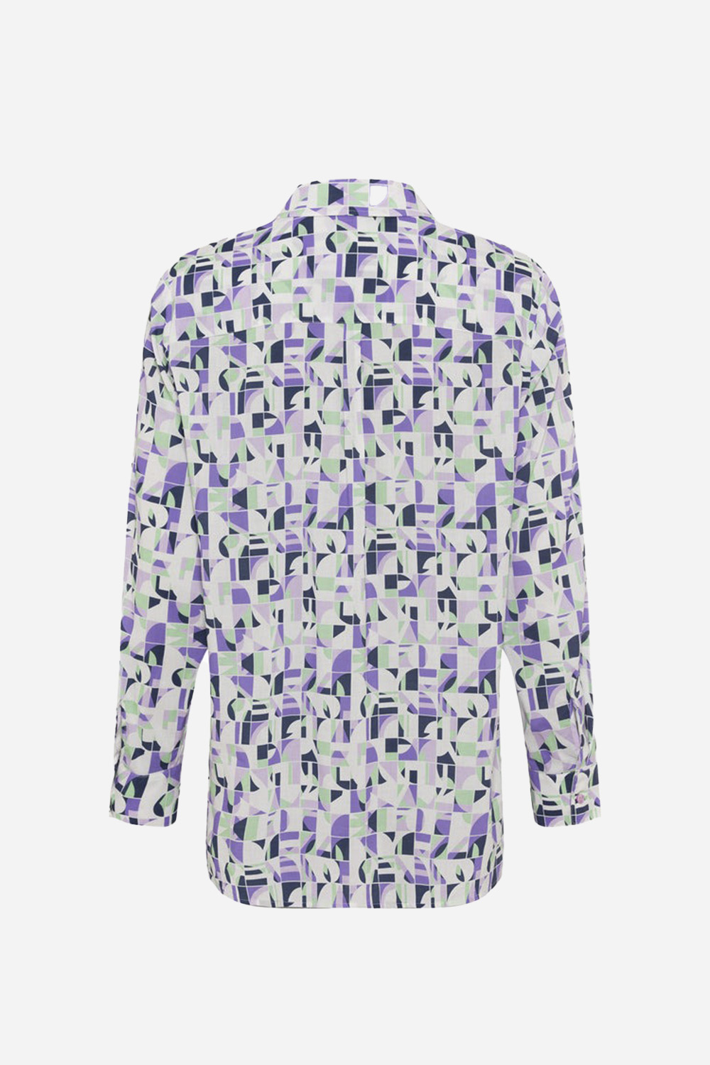 Блуза с ярким геометрическим узором по всей поверхности в пастельных тонах включает в себя классические элементы рубашки, такие как воротник-стойка, застежка на пуговицы спереди и манжеты в вычурном стиле. Сочетание материалов обеспечивает ощущение исключительной легкости и воздушности на коже.