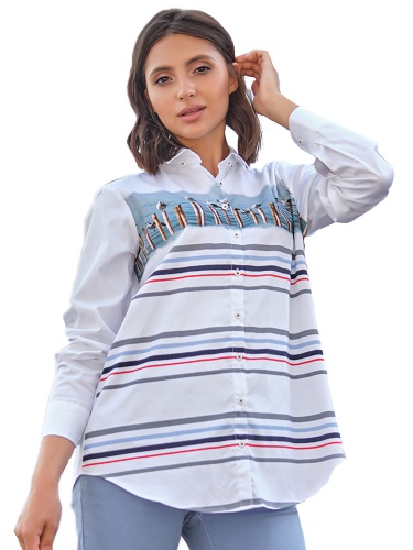 Рубашка классического кроя в морском дизайне. Отложной рубашечный вортник, втачной рукав полной длины с манжетой. Застежка на пуговицы в тон изделия. Скругленный низ изделия.