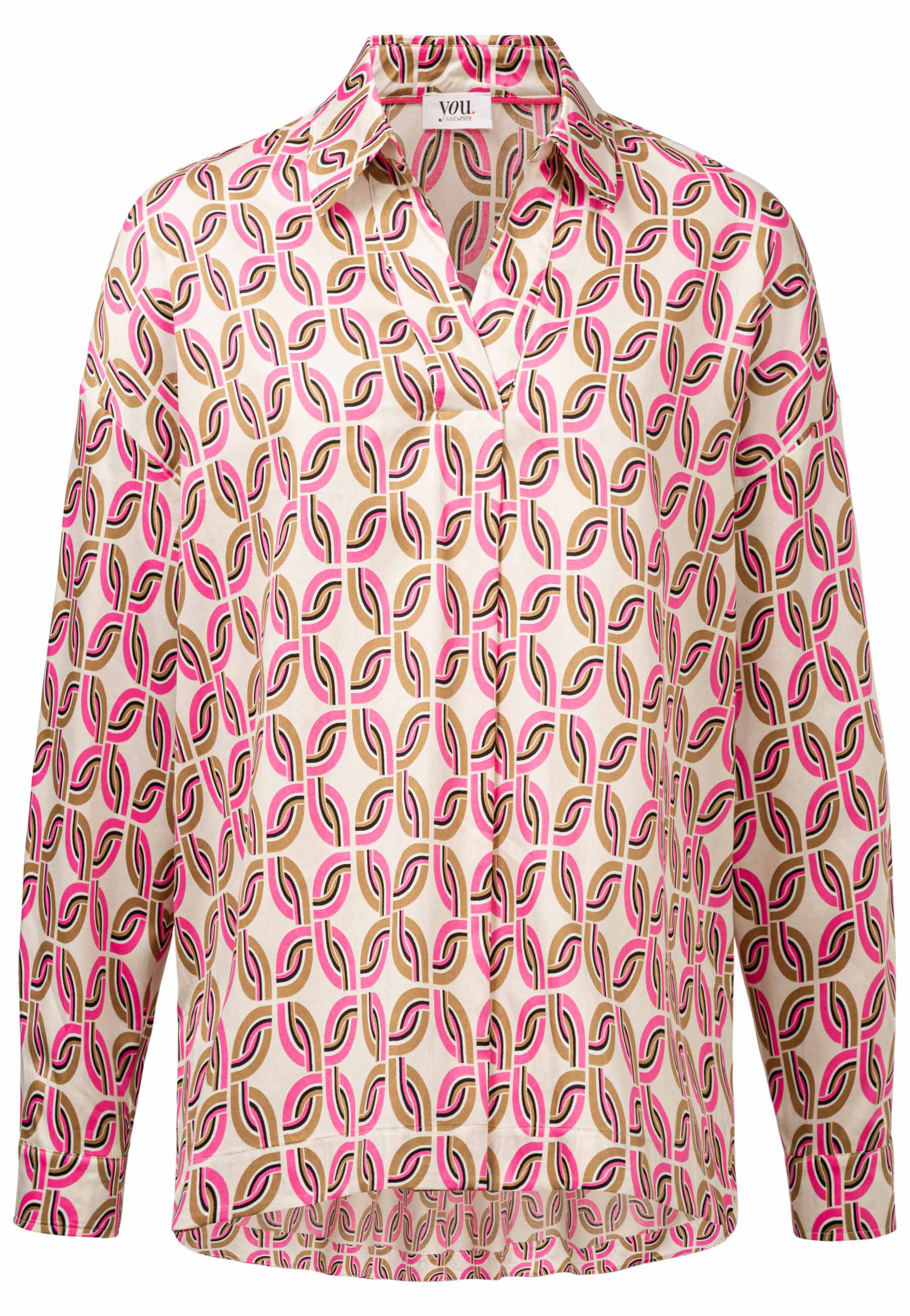 На сайте указаны российские размеры. Креативная блузка-рубашка модного кроя оверсайз. Яркие цвета и крой — выразительный графический принт убедительно сочетается со стильным кроем оверсайз. Этому способствует двухъярусный подол, удлиненный сзади, и боковые разрезы. Складки на спине с одной стороны обеспечивают легкое и свободное ниспадание рубашки. Классический воротник рубашки переходит в V-образный вырез, за которым следует складка на одной стороне, что также подчеркивает легкость блузки. Наша модель ростом 177 см. Измерения для размера 44: Окружность груди: 158 см Бедра: 153 см Длина по спинке: 72 см. Длина рукава: 50 см