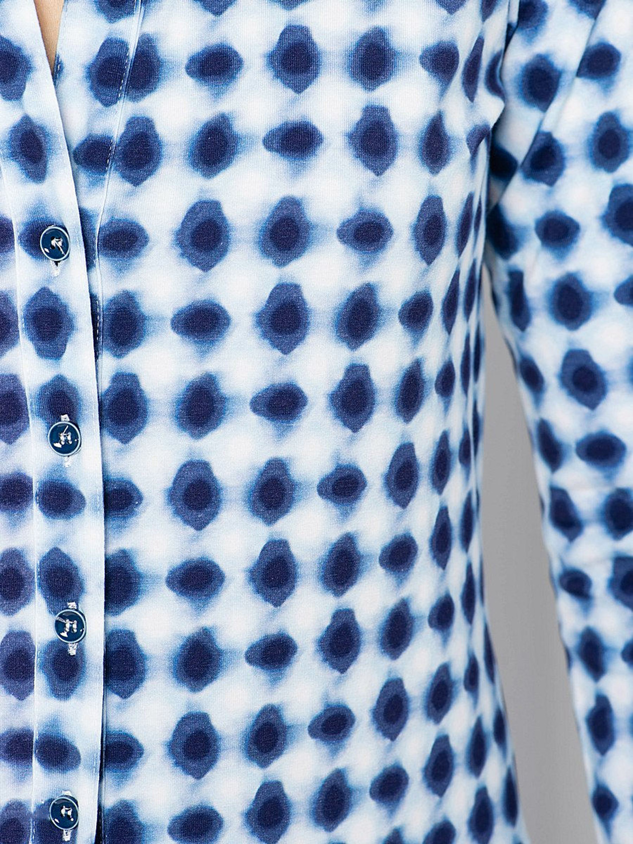 Блузка-рубашка привлекает к себе внимание благодаря трендовому принту батик. Отложной воротничок, V-образный вырез, застежка на пуговицах, длинные рукава с манжетами. Эта женственная модель слегка приталенного силуэта позволит создать множество современных образов!