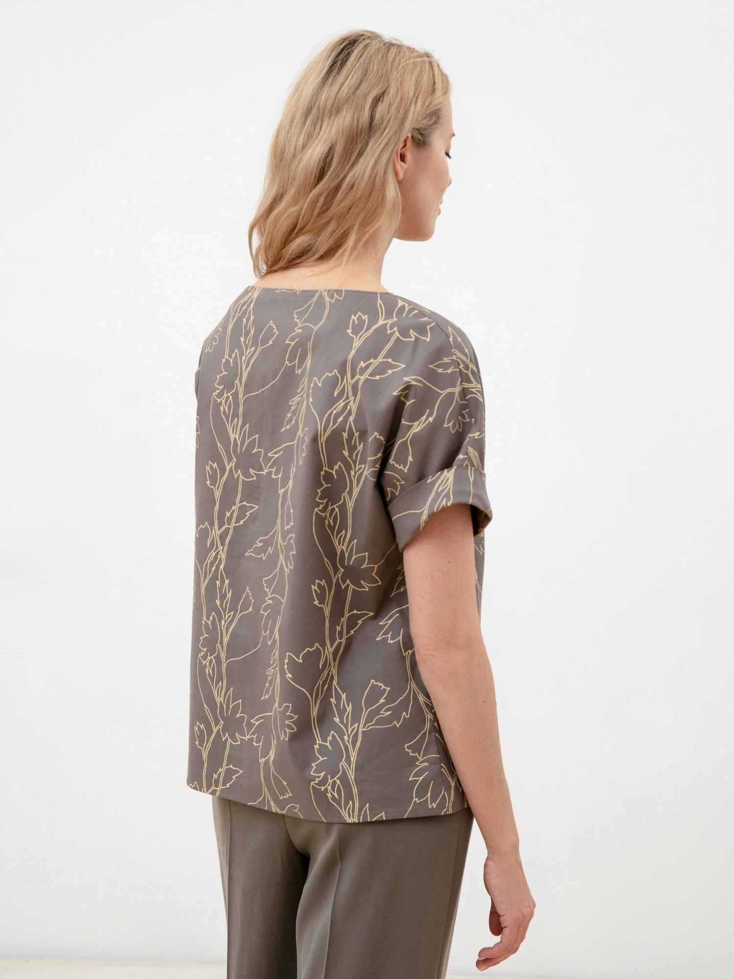 Базовая блуза в стиле оверсайз из хлопковой ткани с цветочным принтом прямого силуэта с коротким рукавом кимоно и горловиной лодочка.