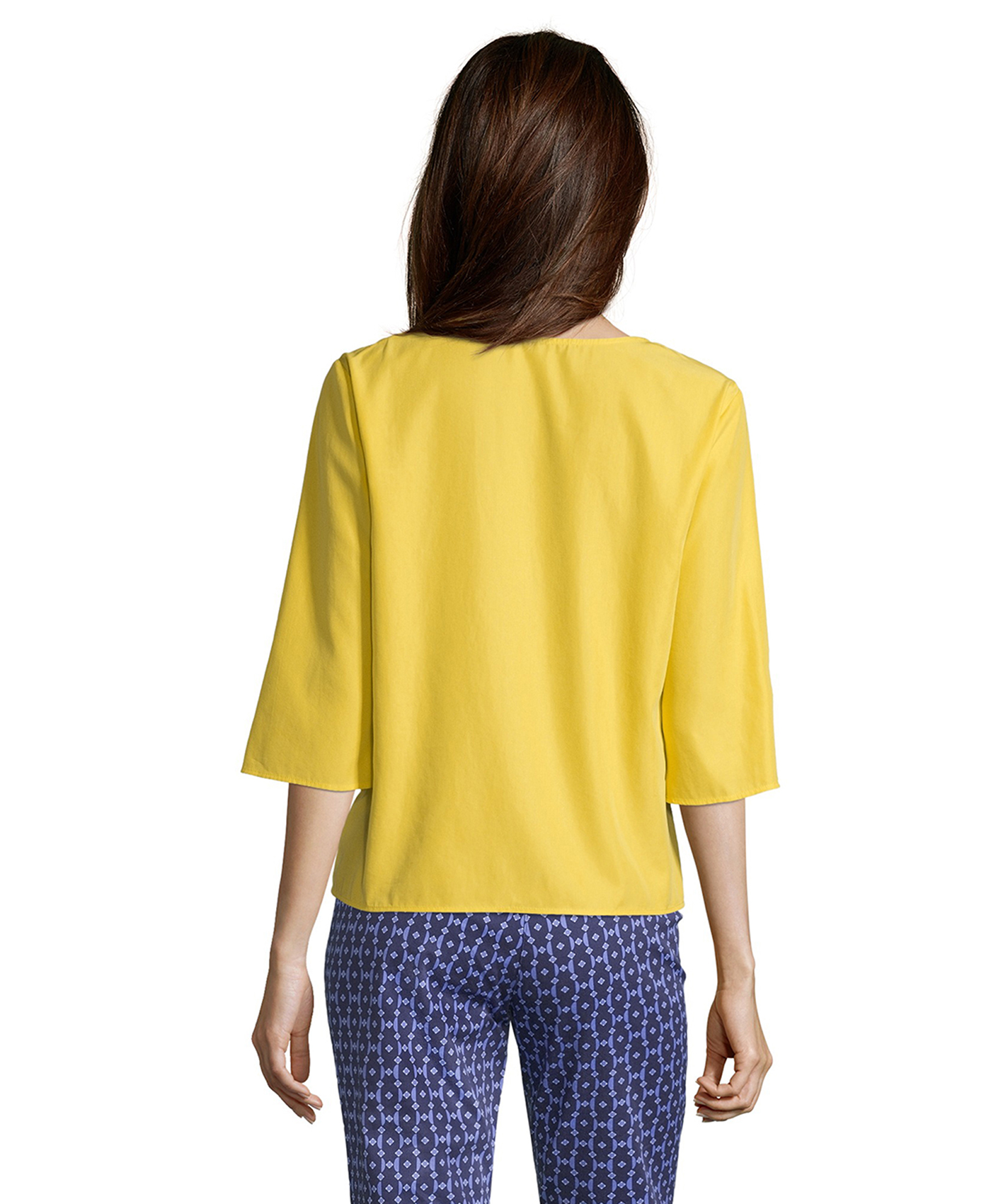Стильная блуза прямого покроя. V-образный вырез горловины, рукава 3/4. Элегантная деталь дизайна - узелок на нижней части переда изделия. Приятный к телу материал из смеси тенсела и полиэстера. Однотонная блуза является универсальной моделью, с которой можно составить множество модных образов!