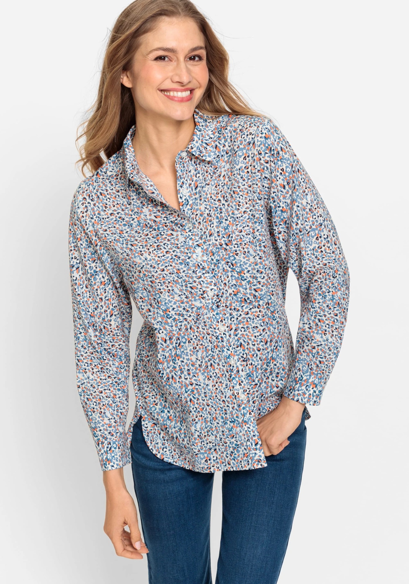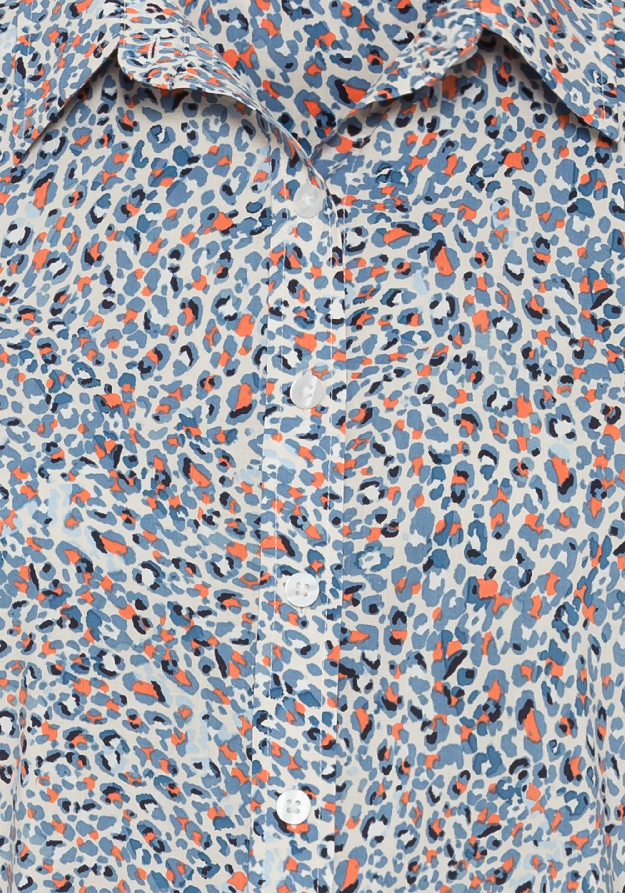 Выдающейся особенностью этой легкой и воздушной рубашки является микро-леопардовый принт по всей поверхности, который сочетает в себе неожиданный синий джинсовый оттенок с оранжевым оттенком. Особенности блузки: отложной воротник, планка на пуговицах спереди и манжеты на пуговицах. Хлопковые волокна обеспечивают легкость и воздухопроницаемость, вискозные волокна создают ощущение мягкости на коже.