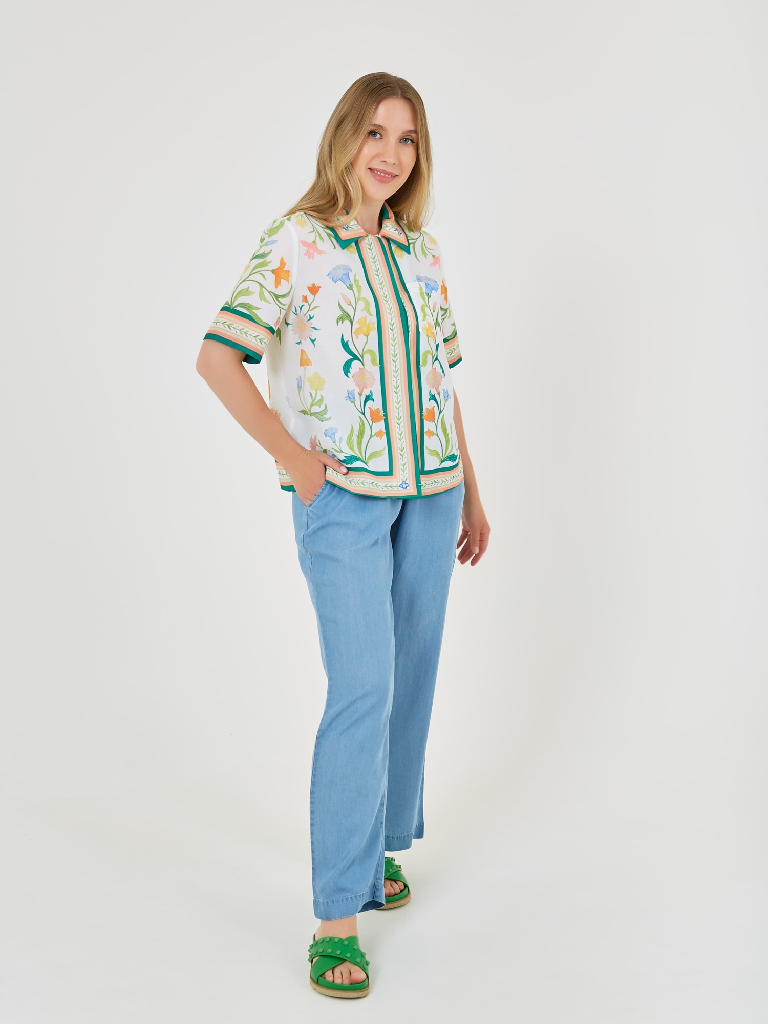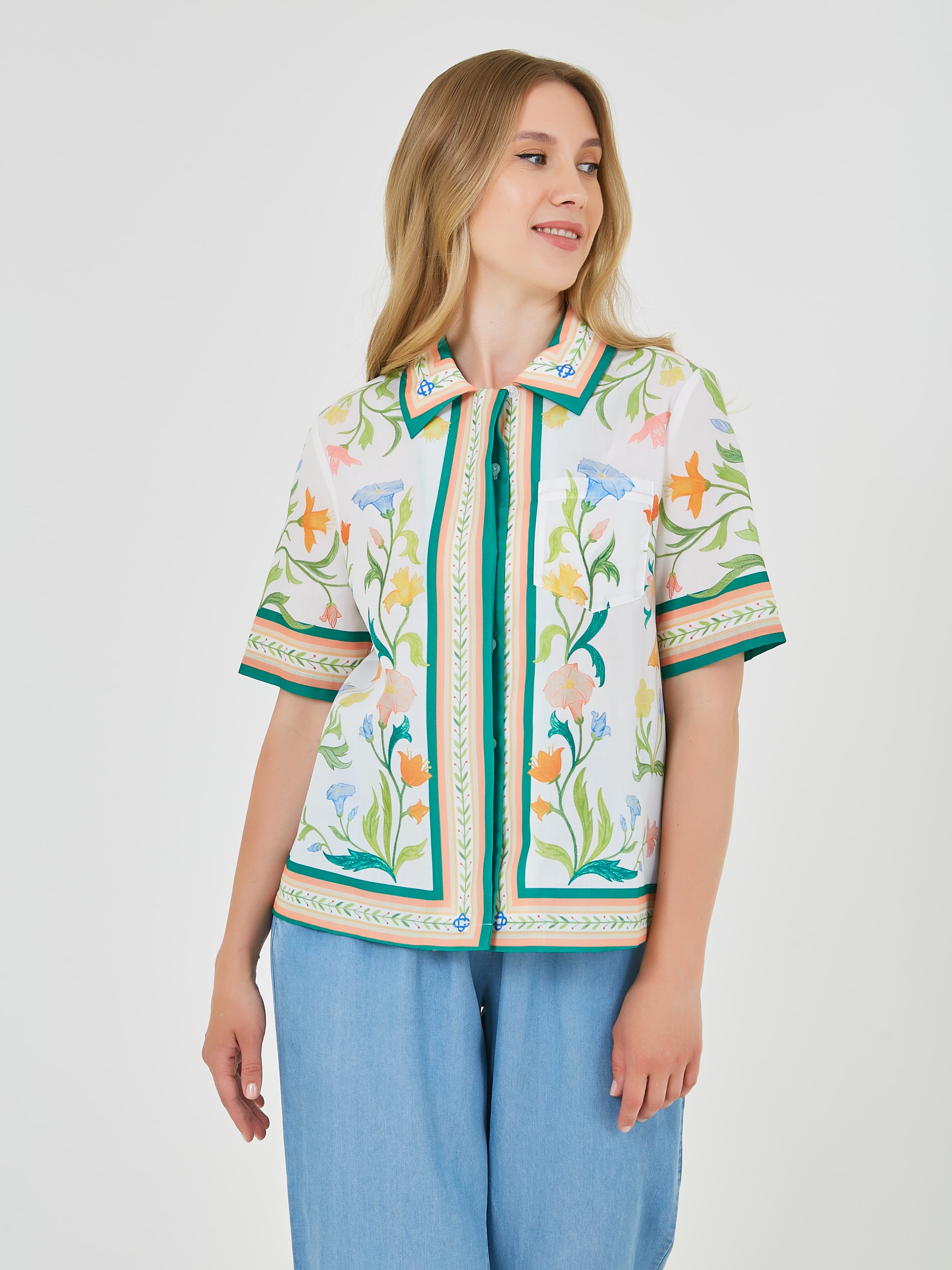 Женская рубашка с короткими рукавами и спрятанными пуговицами. Принт в виде цветов и листьев в теплых тонах расположен в рамках на рубашке. Коллекция Весна-Лето 2025. Капсула "Марракеш". Параметры модели: 89-70-92, рост 167, размер 44-46