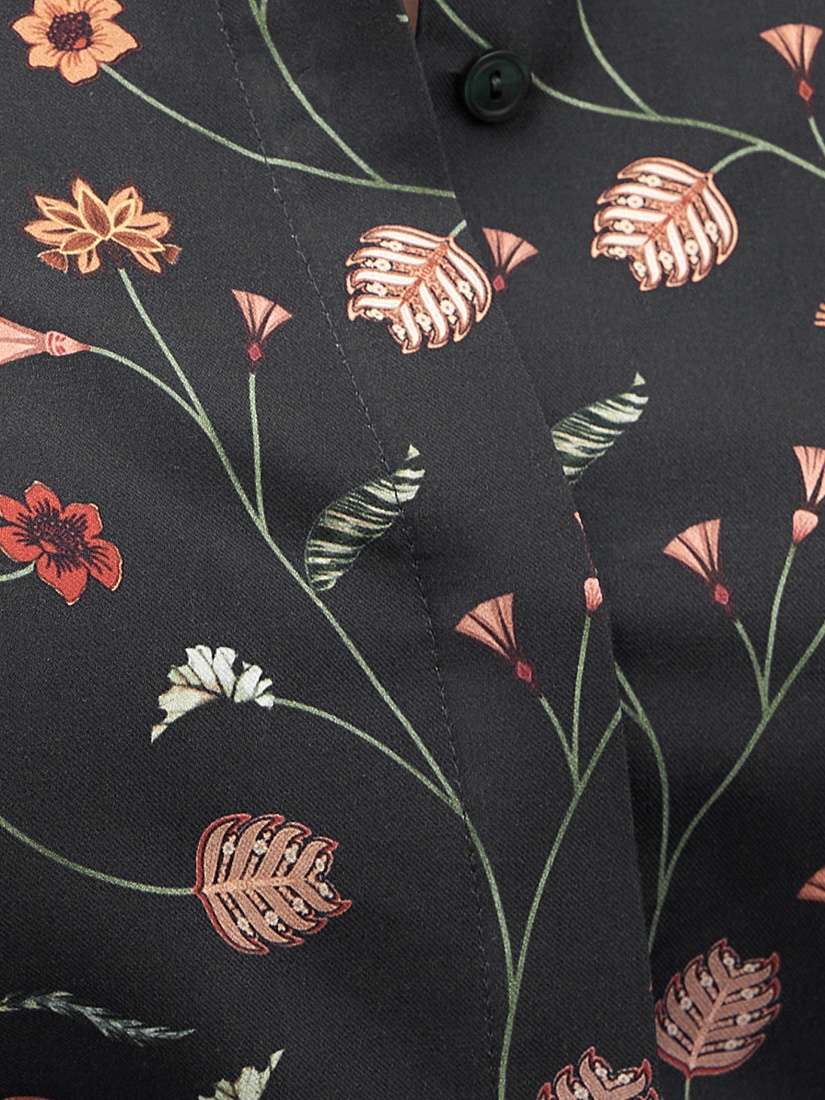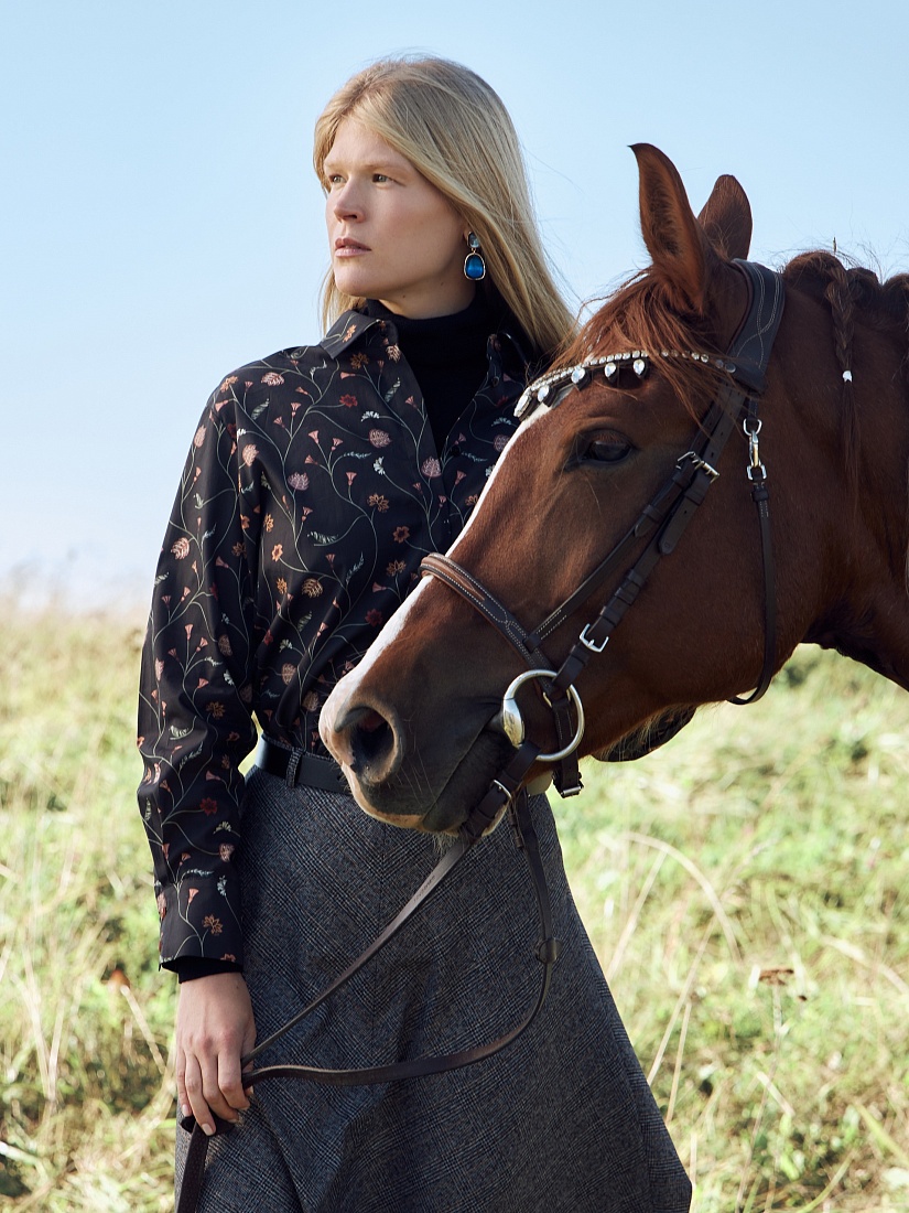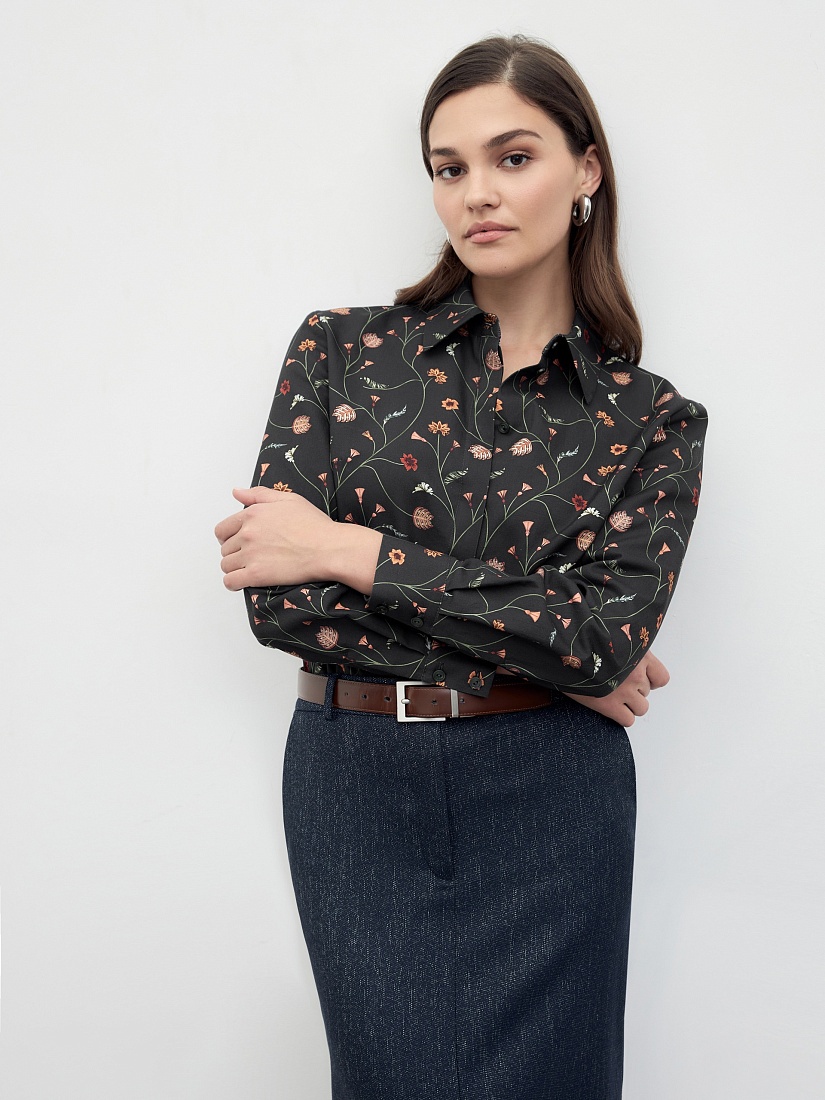 Прямая удлиненная блуза из принтованной хлопковой ткани, с классическим отложным воротником и супатной застежкой на пуговицы. Рубашечный широкий рукав на узком манжете. На спинке кокетка со складкой.
