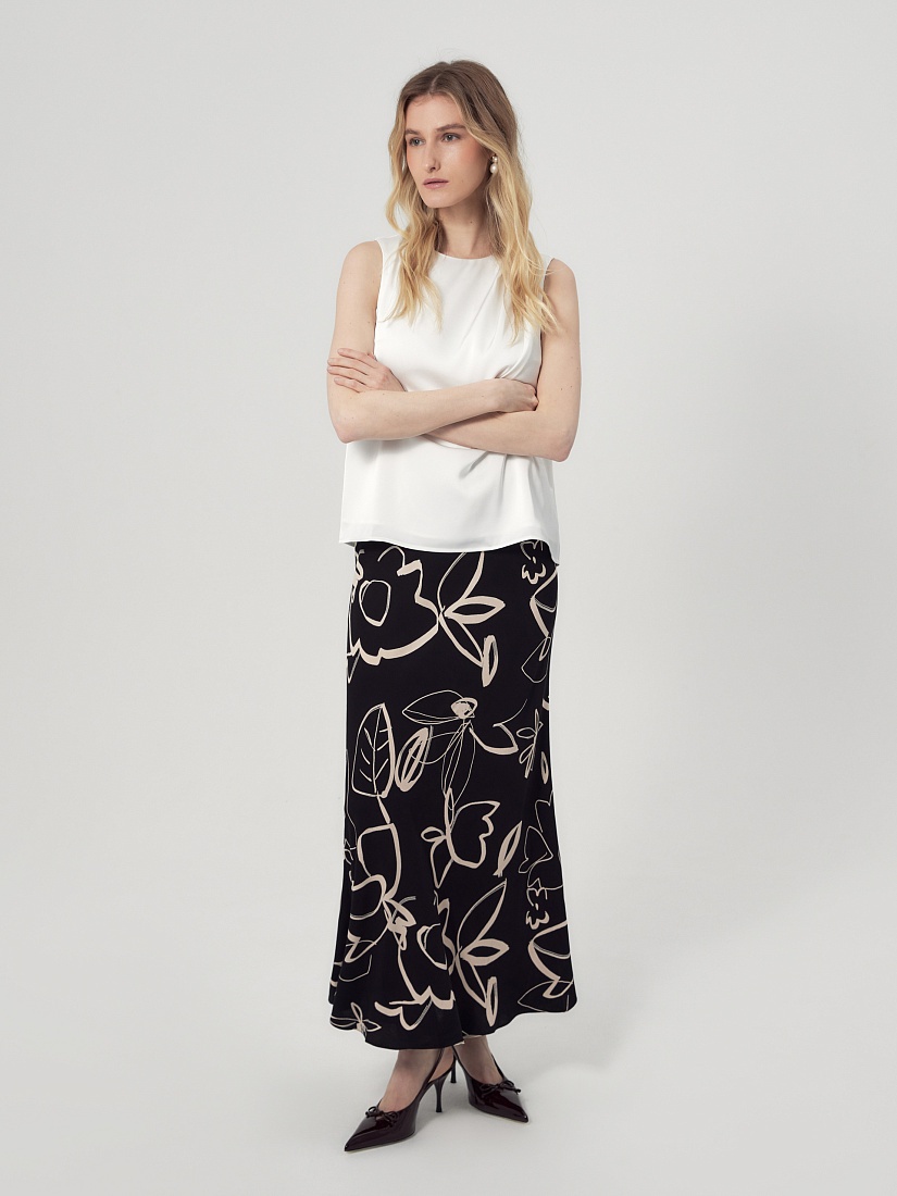 Прямая блуза из молочного атласа с круглой горловиной и складками по плечу. На спинке капелька и пуговицы.