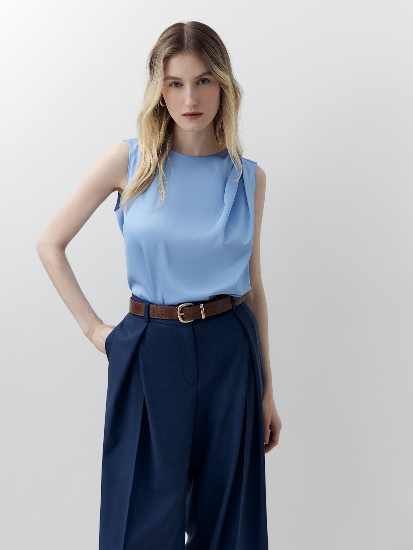 Прямая блуза из голубого атласа с круглой горловиной и складками по плечу. На спинке капелька и пуговицы.