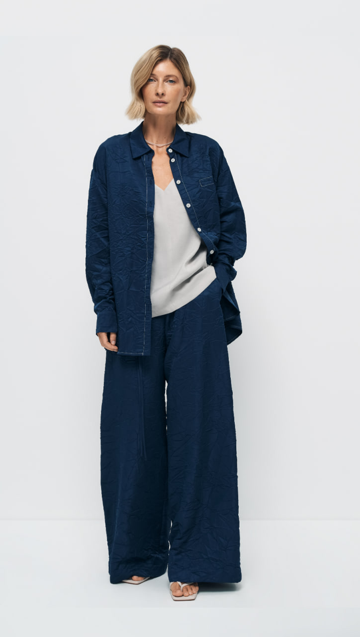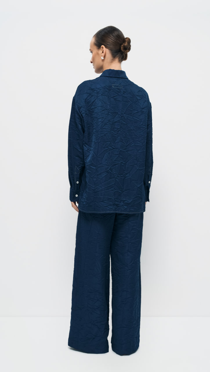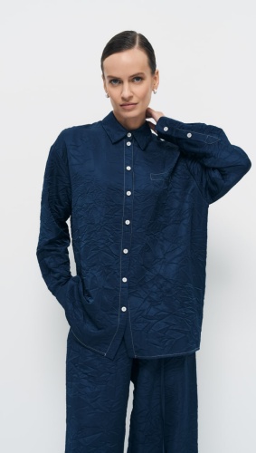 Темно-синяя блуза прямого удлиненного силуэта выполнена из мягкой, приятной на ощупь вискозы с мятым эффектом. Центральная застежка на 7 петель и 7 пуговиц, расположенная по центру переда, придает блузе элегантность и классический вид. Отложной воротник с отрезной стойкой подчеркивает линию шеи и добавляет изюминку в образ.