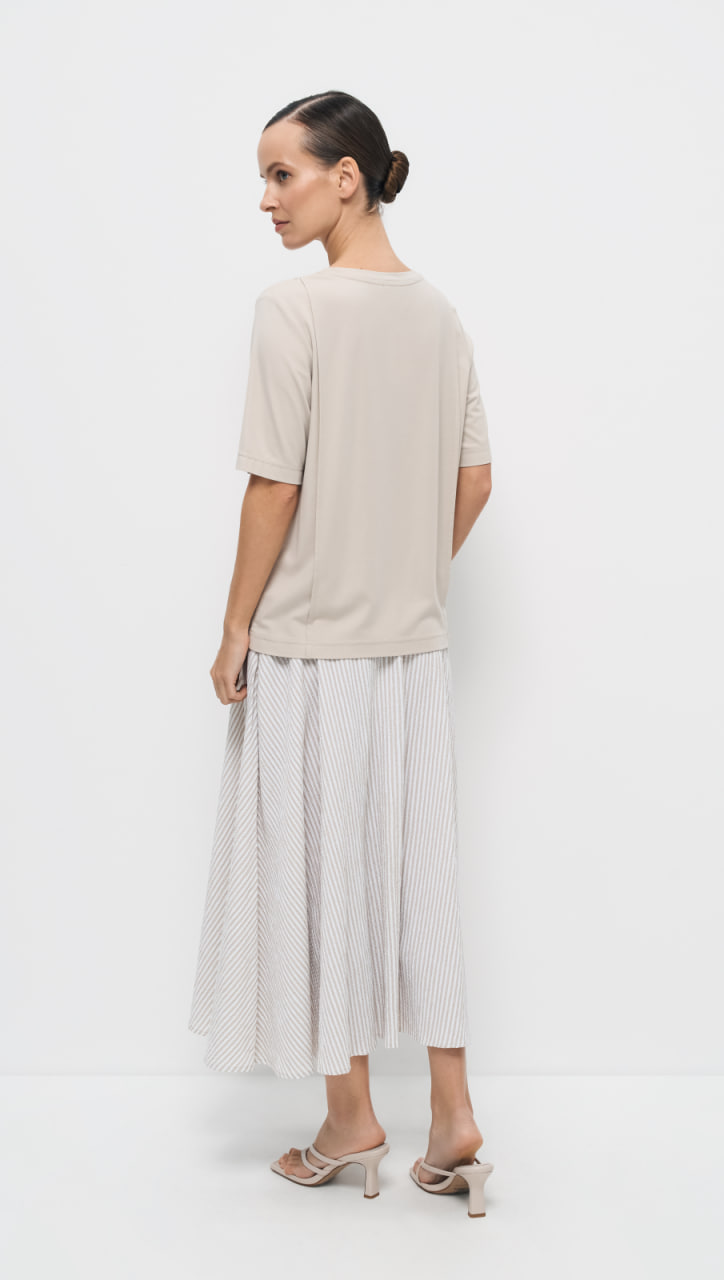 Свободная блуза прямого кроя создана из высококачественной испанской вискозы в нежном оттенке «облачное утро». Модель отличается интересным дизайнерским решением — вертикальными защипами, расположенными по передней и задней частям изделия, а также на рукавах. Эти элементы придают изделию структурированность и утонченность, создавая гармоничный и продуманный образ.