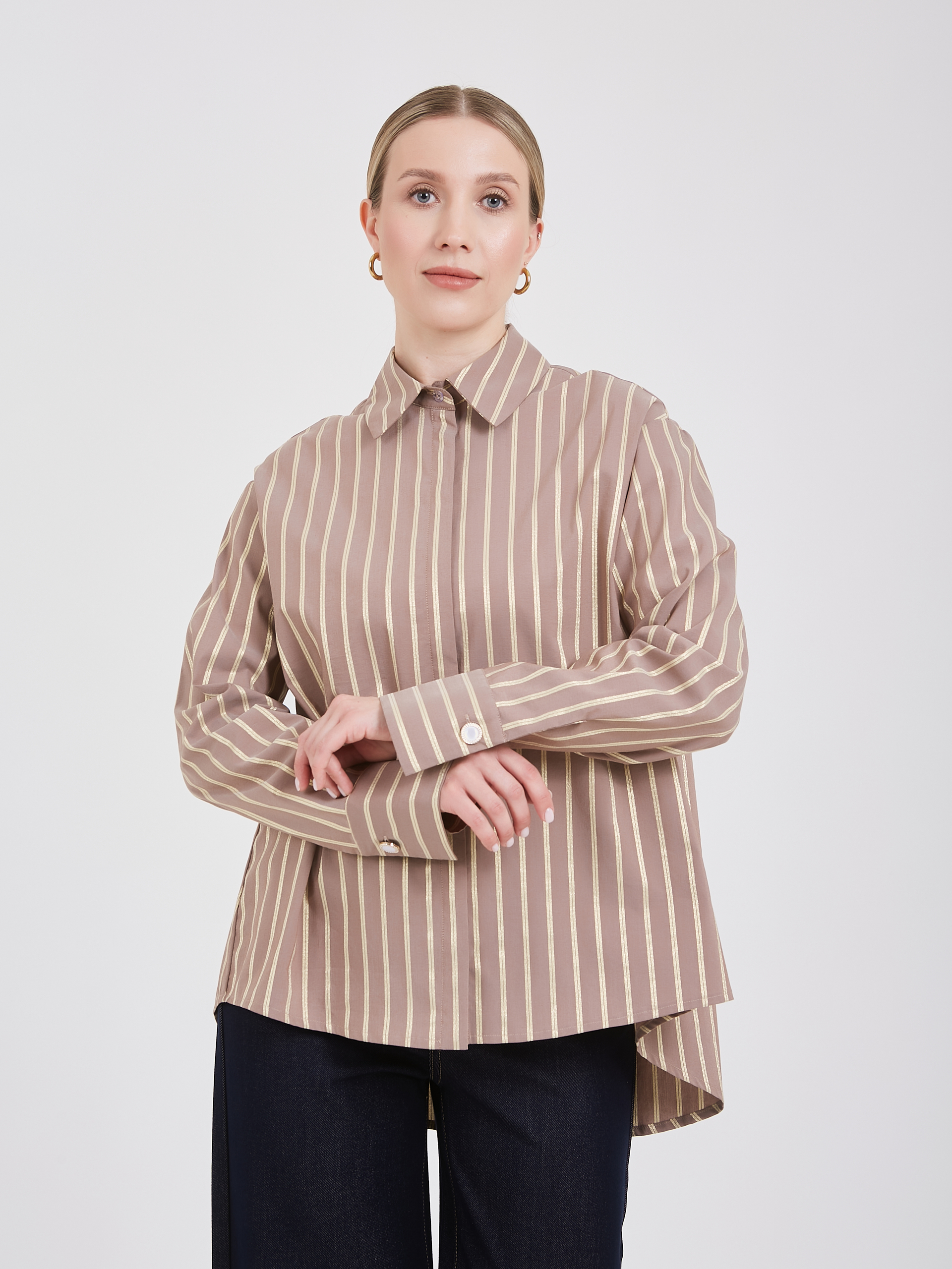Коричневая полосатая рубашка классического стиля. Тонкие вертикальные полоски цвета слоновой кости придают изделию изысканный и утончённый вид. Классический воротник и длинные рукава с манжетами подчёркивают элегантность и универсальность модели. Прочная ткань высокого качества обеспечивает комфорт и долговечность, идеально дополняя повседневные и офисные образы.