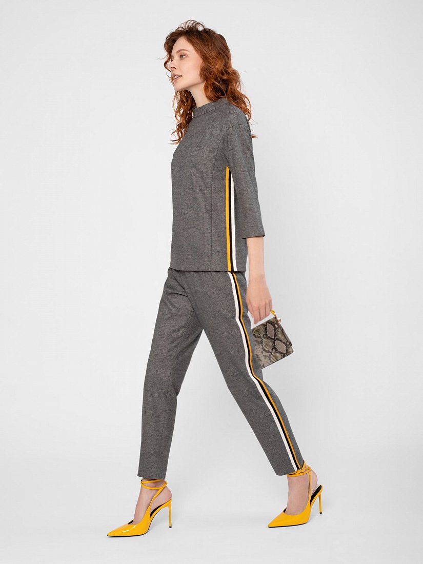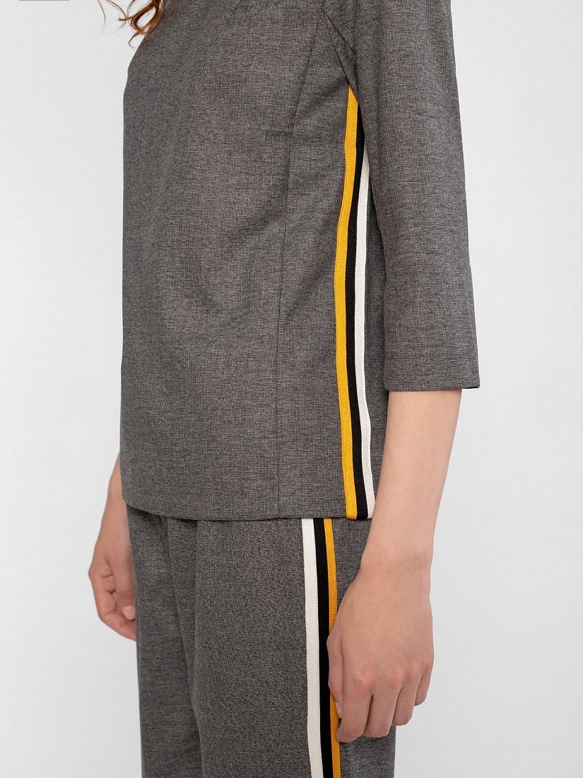 Блуза из костюмной ткани прямого силуэта с воротником стойка, спущенным плечом и укороченным рукавом. По бокам контрастные лампасы из тесьмы в полоску. Сзади застежка на потайную молнию.