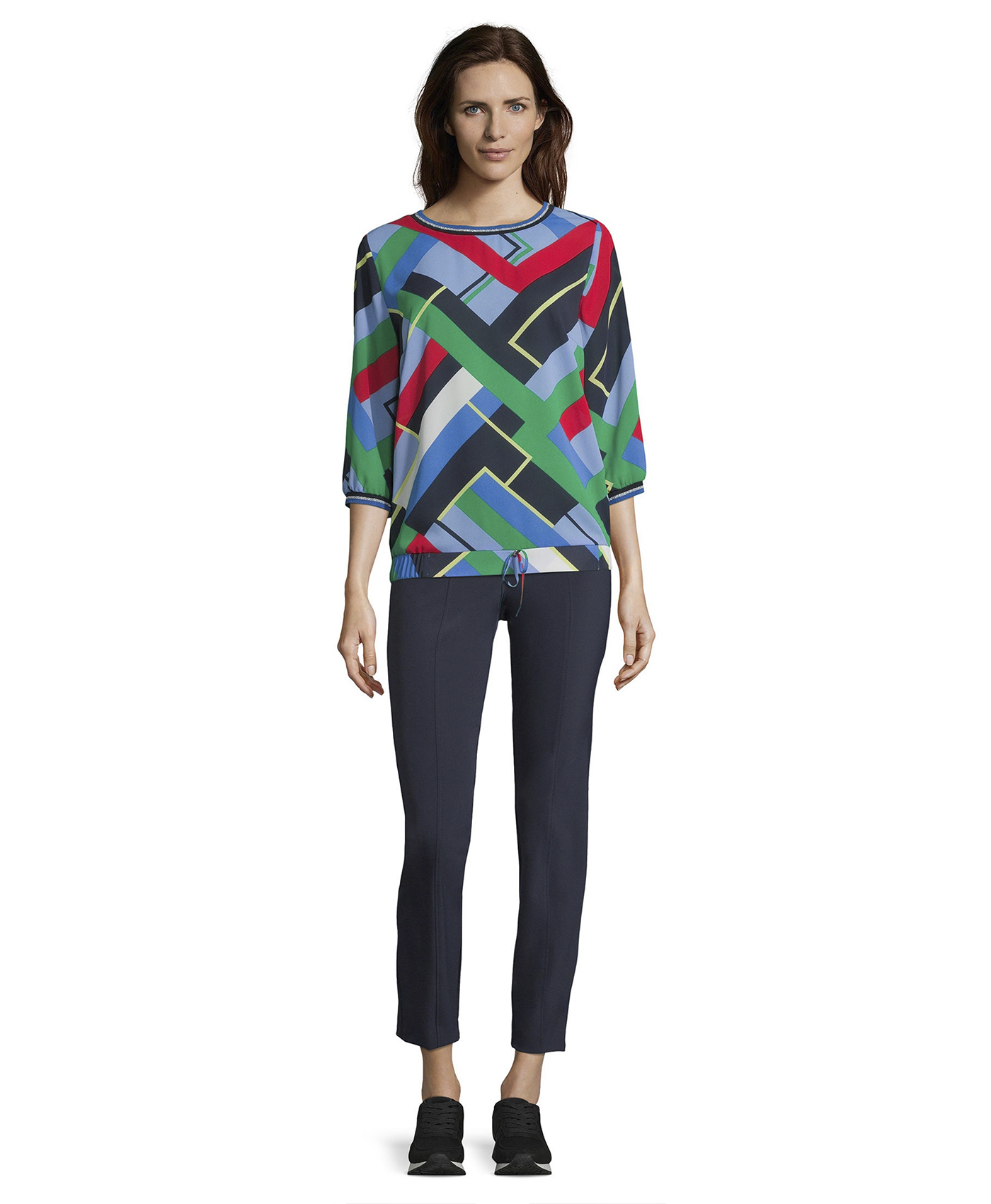 Новая вариация трендового принта колор-блок. Блуза свободного кроя собрана на бедрах эластичной лентой. Круглый вырез горловины, рукава 3/4. Блестящая нить люрекса в отделке горловины и манжет придает образу нотку гламура. Блуза отлично смотрится с любым однотонным вариантом низа и любой обувью.