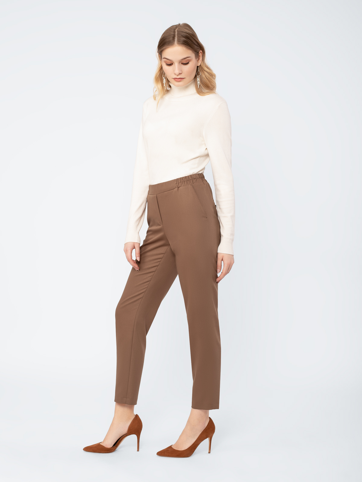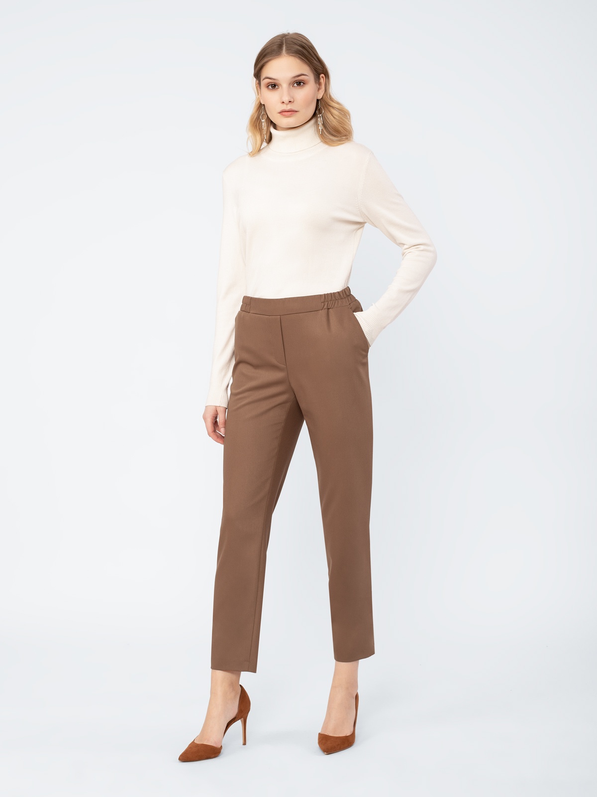 Брюки в стиле кэжуал, зауженные к низу, длина 7/8. Средняя посадка. Пояс на резинке. Спереди заложены складки. Боковые карманы рабочие.