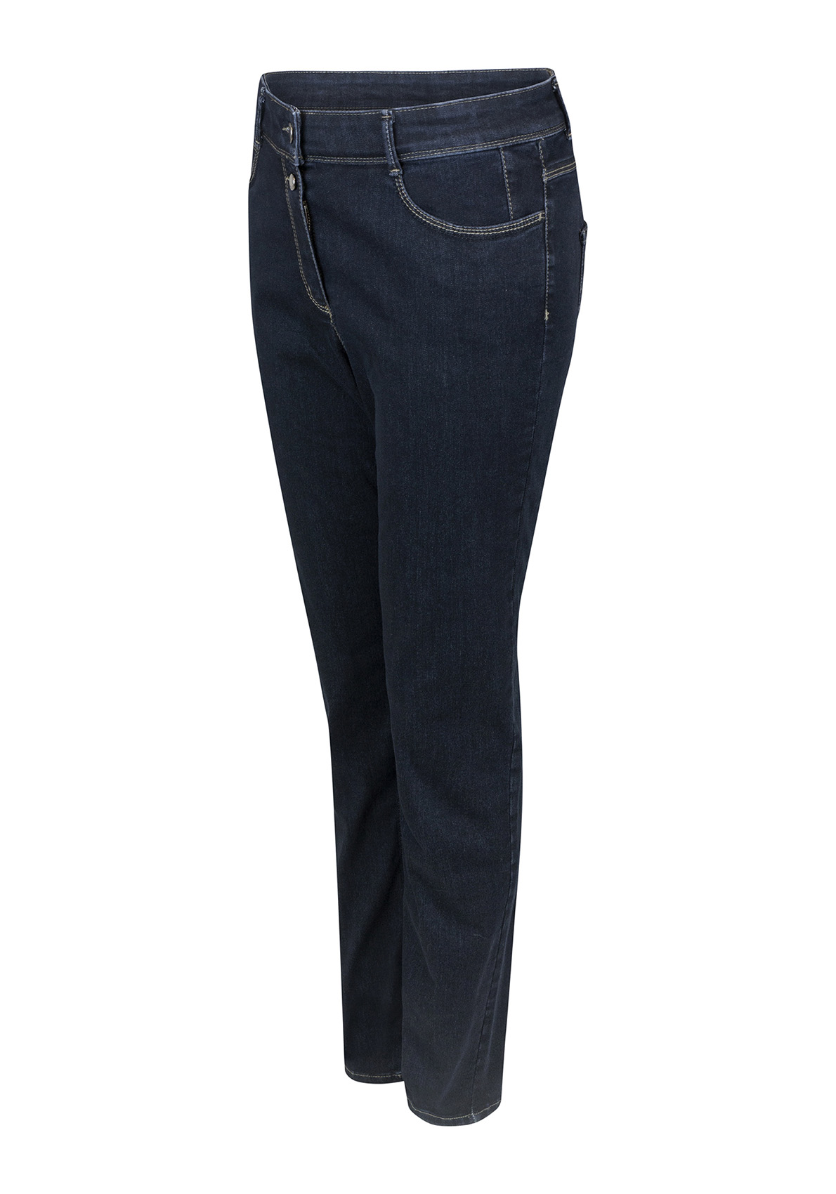 Модные джинсы с пятью карманами. Высокий пояс на пуговицах, зауженный крой. Модель очень комфортна в носке благодаря материалу из эластичной хлопковой смеси. Джинсовые брюки полной длины идеально подходят к любому стильному образу благодаря своему лаконичному дизайну. Эта модель идеально сочетается как с женственной блузкой, так и с повседневной футболкой.