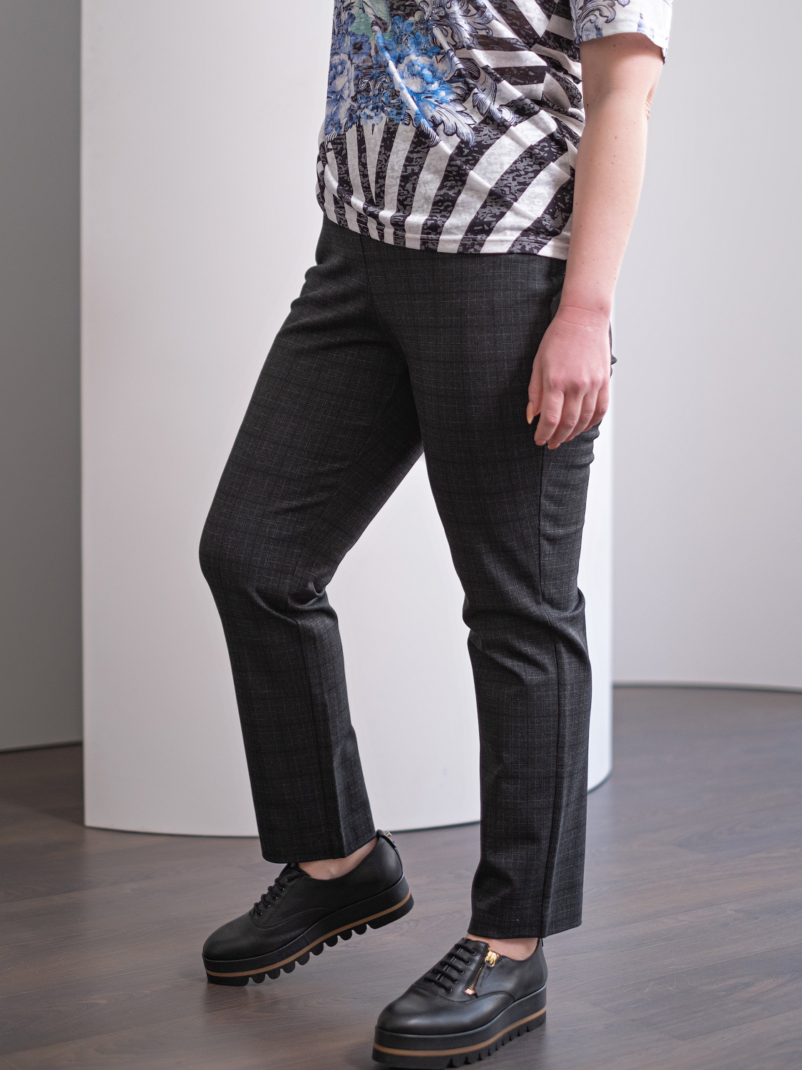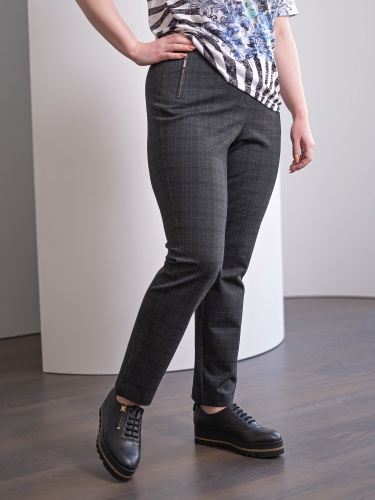 На сайте указаны российские размеры. Прямые клетчатые брюки – универсальный вариант для офисного и повседневного образа. Комфортная средняя посадка, боковые карманы на молнии, эластичный пояс, замок-молния спереди. Крой: модель прямого силуэта с завышенной линией талии позволяет подчеркнуть достоинства фигуры и скрыть возможные недостатки. Прямой крой и идеальная посадка брюк обеспечивают максимум комфорта. Имеют два кармана по бокам. Отделка: карманы закрываются на стильную декоративную молнию, которая добавляет изделию оригинальности и приковывает внимание к деталям.