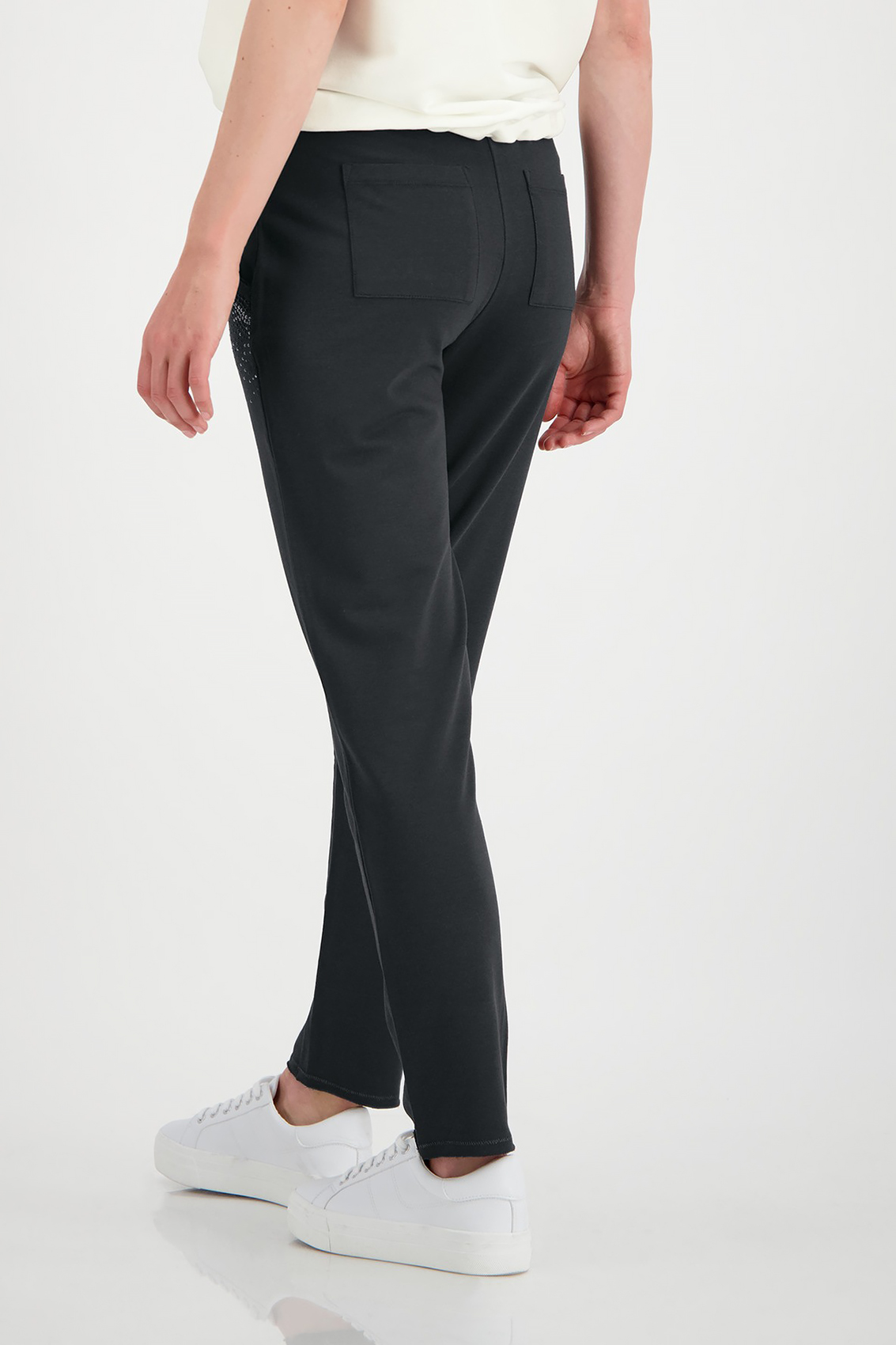 Брюки спортивного стиля. Эластичный пояс с кулиской обеспечивает удобную посадку и комфортное ношение. Мягкий и приятный телу материал. Боковые карманы украшены стразами. Сзади накладные карманы.