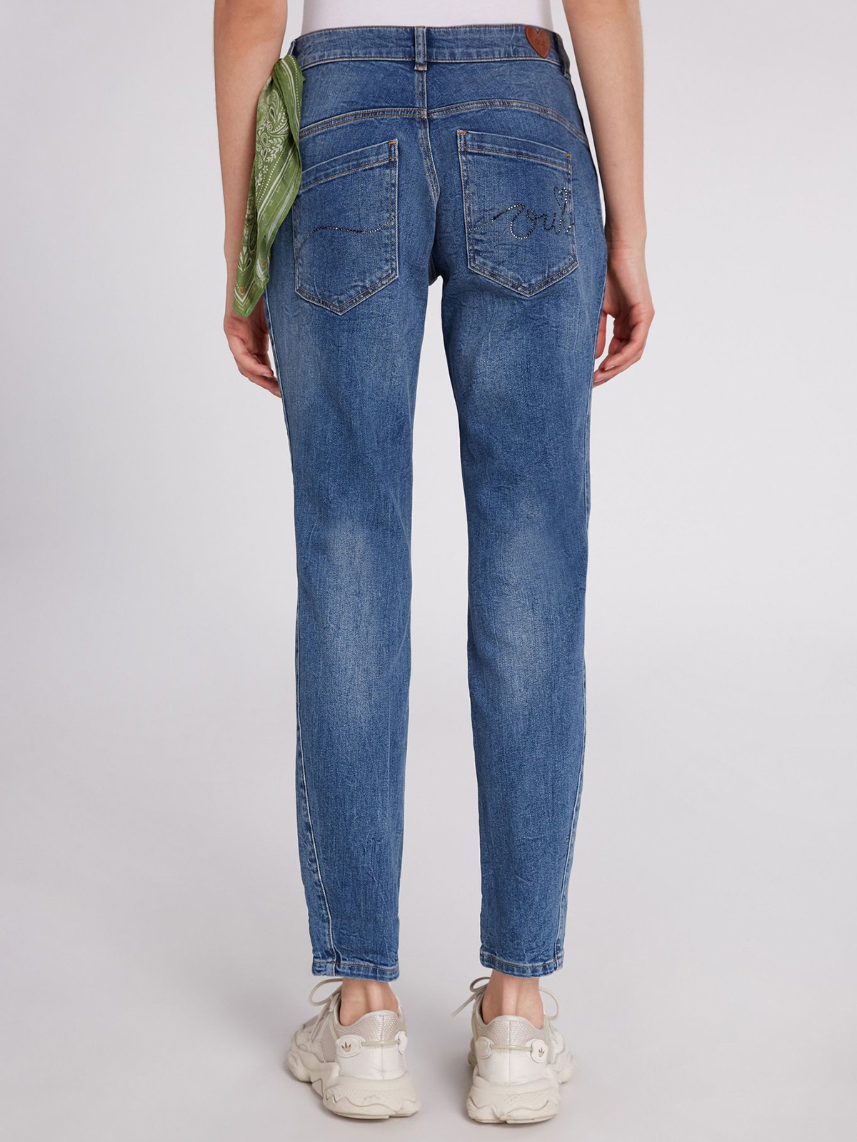 Укороченные джинсы с потертостями и декоративными вытачками на коленях. Комфортная средняя посадка, притачной пояс со шлевками. В комплекте идет стильный платок, который рекомендуется повязывать на одну из шлевок в качестве акцентной детали. Рост модели 178 см, ее размер – 42 (российский).