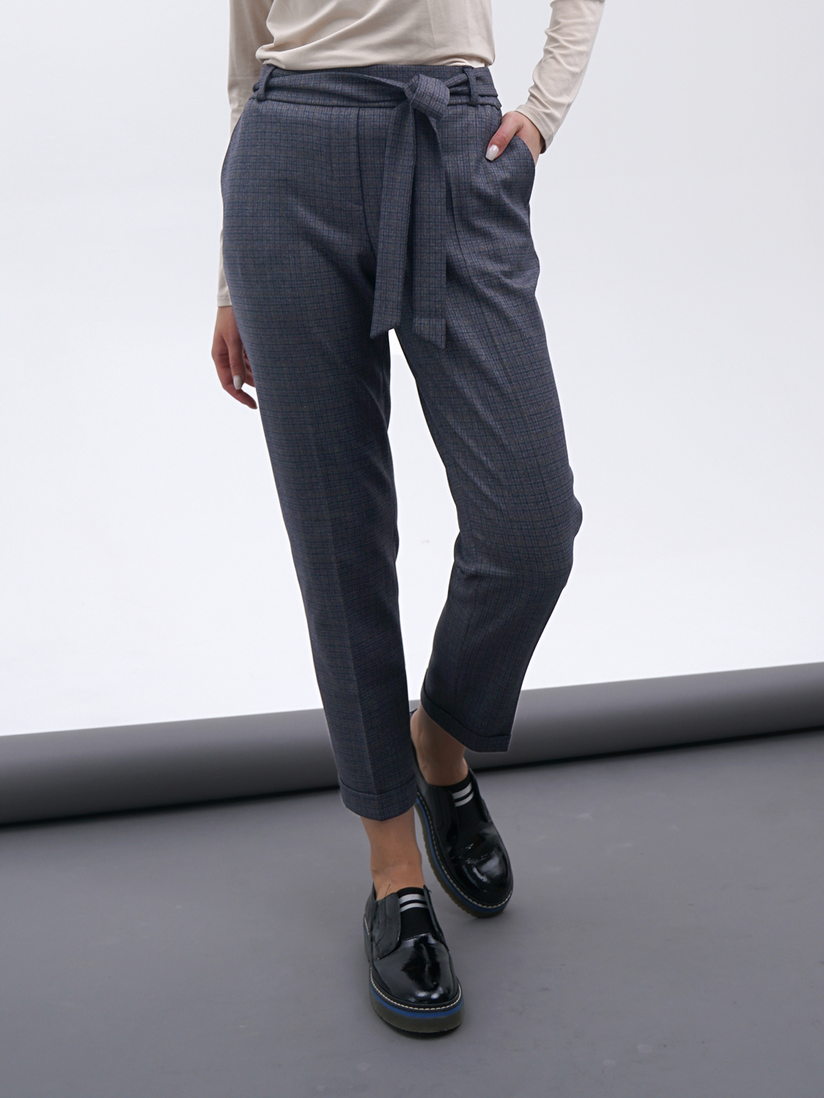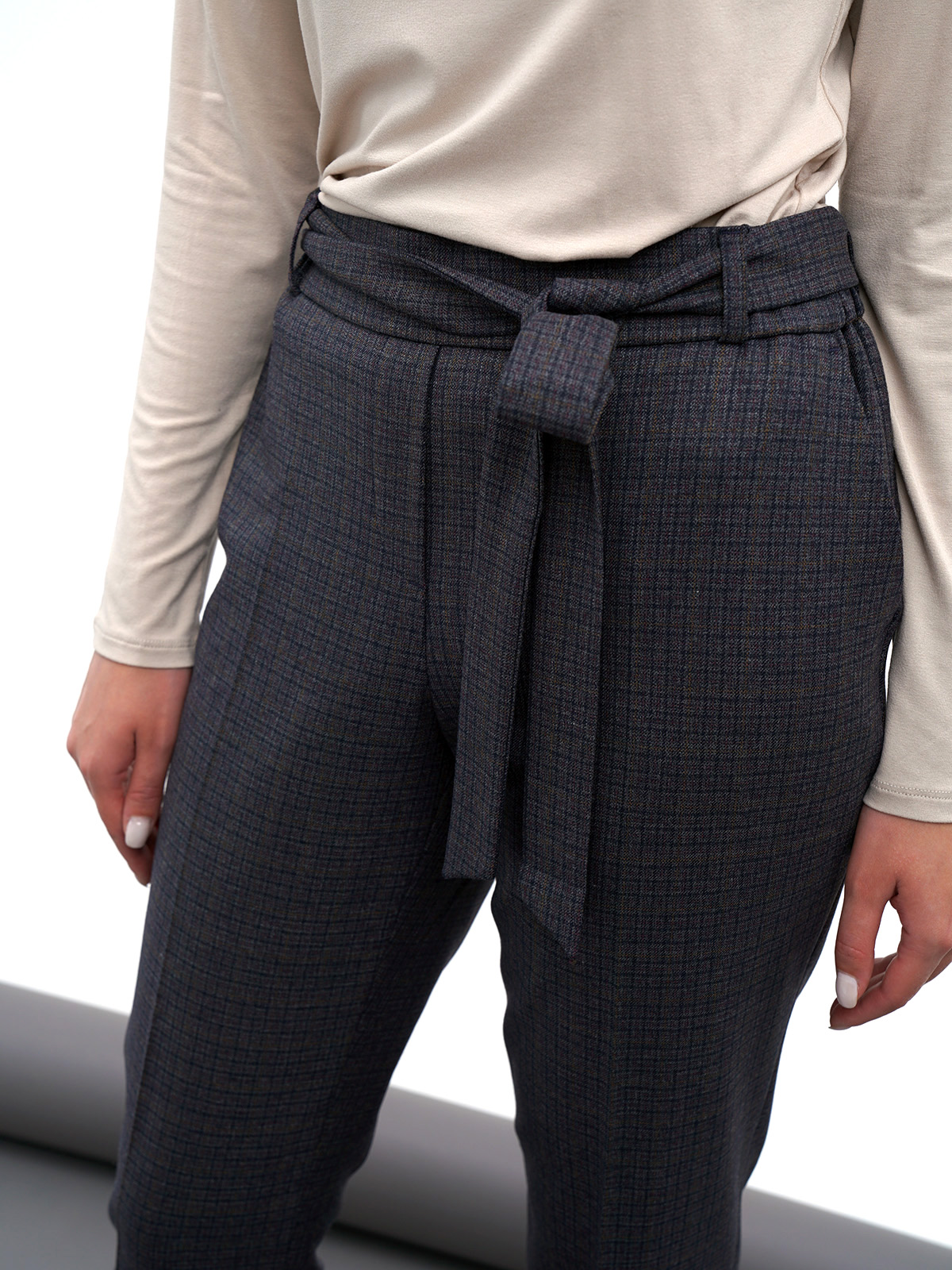 На сайте указаны российские размеры. Укороченные брюки в клетку подходят как для делового, так и для городского повседневного образа. Стрелки визуально вытягивают рост. Комфортная средняя посадка, притачной пояс со шлевками. В комплекте идет тканевый пояс из основного материала изделия. Крой: стильные брюки актуальной длины 7/ 8 имеют высокую посадку, которая подчеркивает линию талии и визуально делает ее тоньше. Прямой зауженный силуэт создает идеальную вертикаль, которую усиливают и стрелки – образ становится вытянутым и стройным. Удобные карманы по бокам позволяют спрятать в себя самые необходимые предметы – телефон, ключи и банковские карты. В задней части брюк присутствуют нефункциональные карманы-рамочки, которые добавляют женственности. Отделка: завязной пояс – украшение модели. Его можно завязать как стильным узлом, там и романтичным бантом и подчеркнуть красоту талии. В нижней части модели расположены манжеты, которые подчеркивают изящество щиколоток.